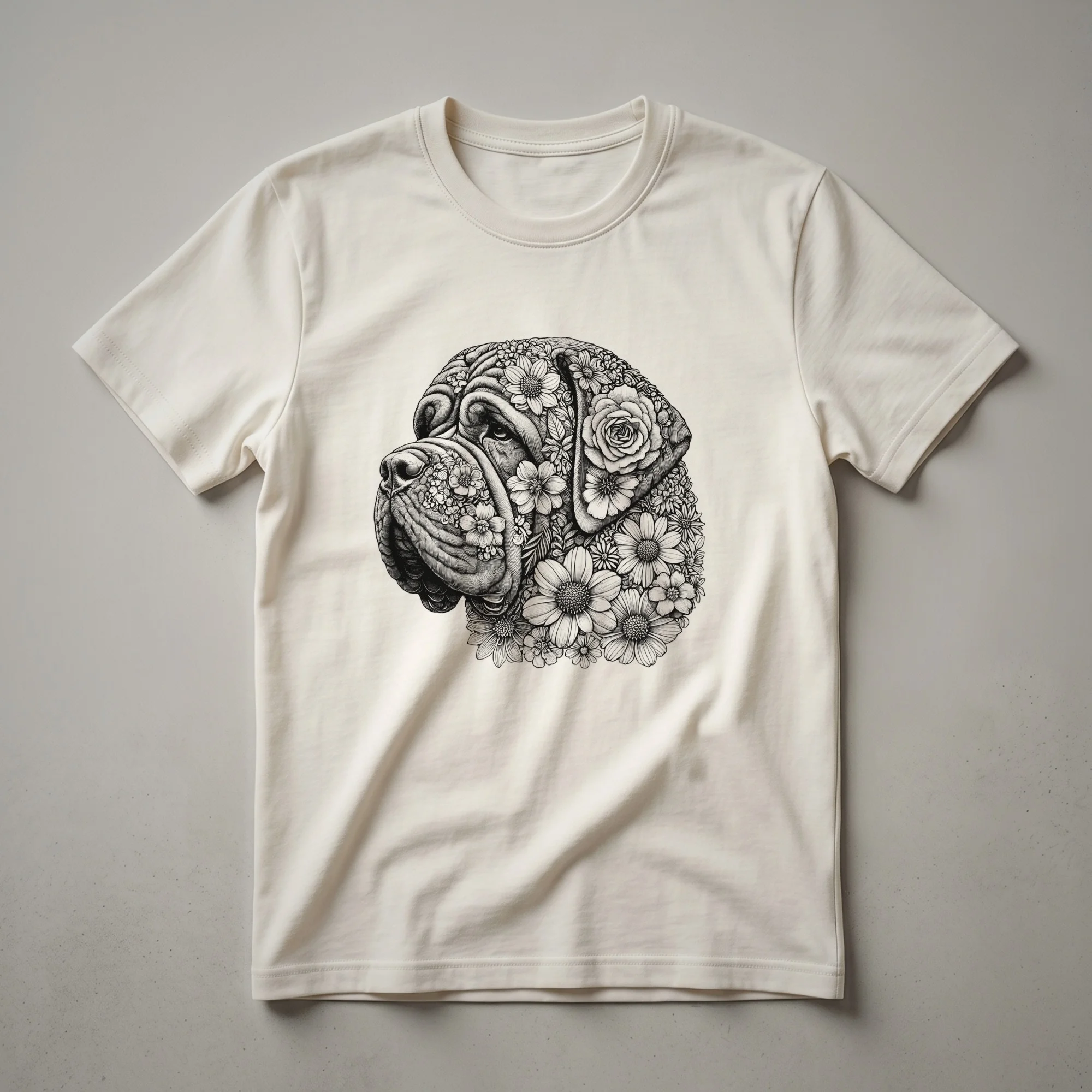 - English Mastiff mom tee showcasing a floral dog face design and breed pride.