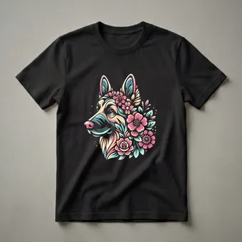 - This German Shepherd floral face tee showcases canine charm with artistic flair.