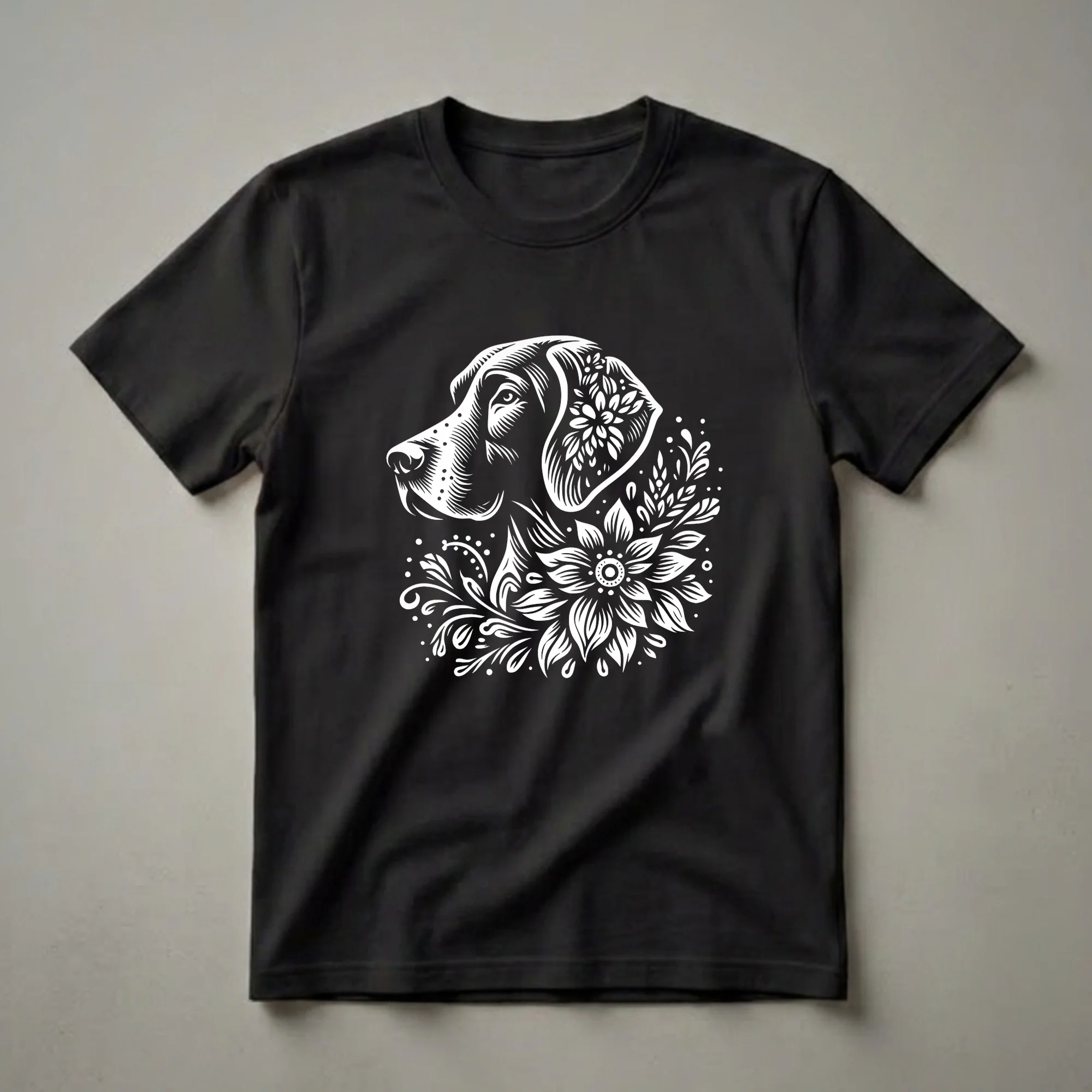 German Shorthair Pointer owners know the breed's distinctive energy and affectionate nature. This striking graphic tee captures that spirit with a beautifully rendered linework illustration of a German Shorthair's head, intricately detailed with blooming flowers and swirling foliage. The white design pops against a dark background, making it an eye-catching piece for any dog lover. German Shorthairs, originally bred in Germany during the 19th century for hunting, are known for their versatility and intelligence. This shirt is a wonderful way for a proud German Shorthair mom or dad to express their connection to their beloved dog. It makes a thoughtful gift for birthdays, holidays, or just because. Wear this unique t-shirt to your next dog park visit, a casual outing with friends, or while relaxing at home with your canine companion. It's a go-to tee for anyone who cherishes their German Shorthair Pointer.