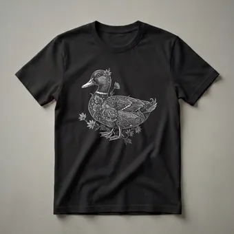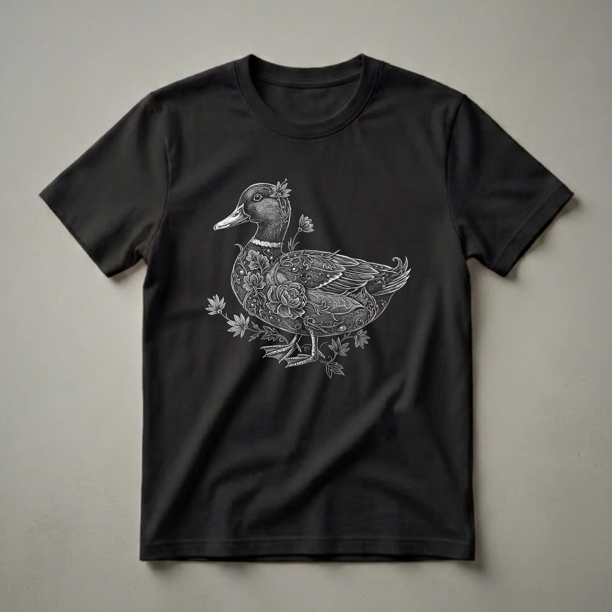 Nature lovers and bird watchers will appreciate the intricate detail of this graphic tee, featuring a beautifully rendered mallard duck. The artwork showcases a mallard, known for its iridescent green head and distinctive call, intricately decorated with delicate floral patterns and swirling vines. This striking design captures the essence of woodland wildlife with an artistic flair. Mallards are one of the most recognizable duck species, often found in wetlands, ponds, and rivers across North America and Europe, making this shirt a nod to familiar natural beauty. This t-shirt is a thoughtful gift for anyone who cherishes the outdoors, enjoys birdwatching, or simply admires unique, nature-inspired art. It's a go-to tee for casual outings, hikes in the woods, or relaxing by the water. Wear this shirt to express your connection to the natural world and celebrate the beauty of waterfowl. This apparel is a wonderful way to carry a piece of the wild with you.