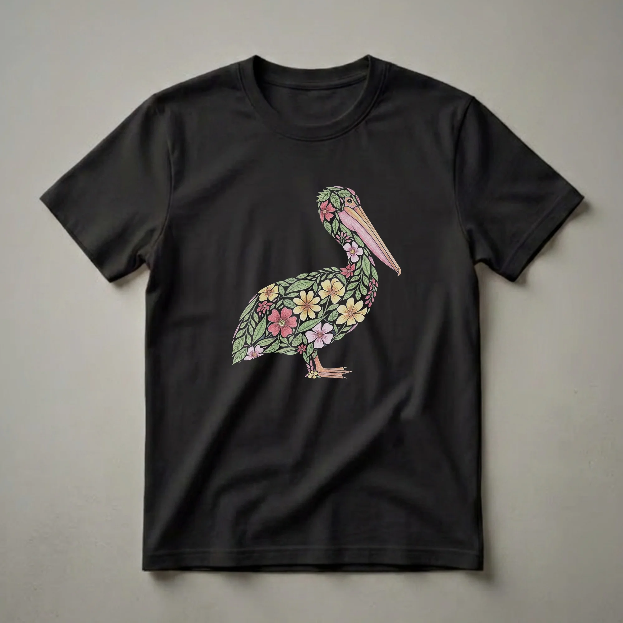 - A unique floral pelican graphic tee for bird lovers.