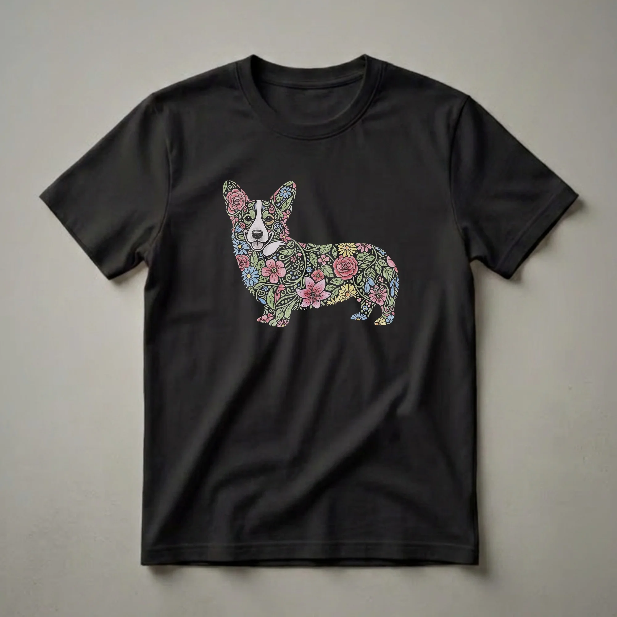 - A unique floral art t-shirt for Pembroke Welsh Corgi moms.