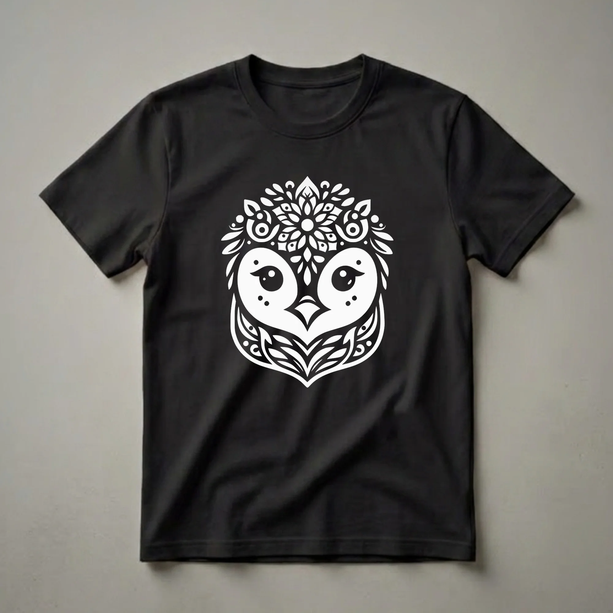 - Features a striking white graphic of a floral penguin face on a black tee.