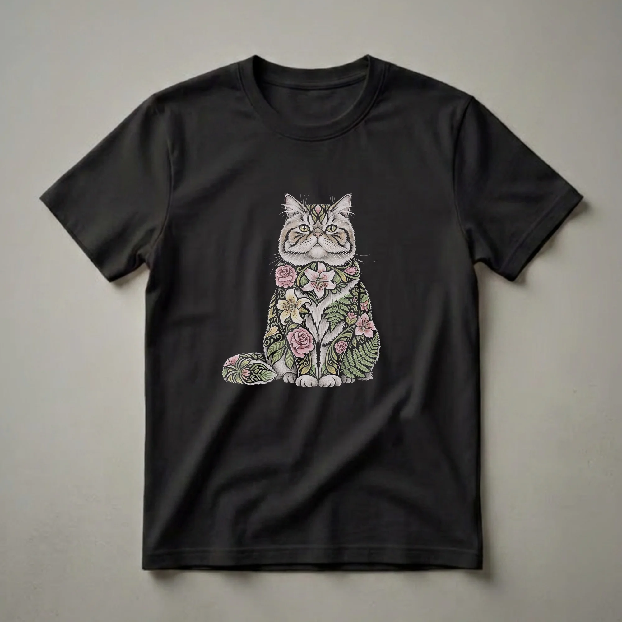 Persian cat owners who appreciate intricate artistry will adore this unique t-shirt. The design features a beautifully rendered Persian cat, its fluffy white chest and tail adorned with a vibrant tapestry of blooming roses, lilies, and lush green ferns. Delicate swirls and leaves weave through the floral elements, creating a captivating visual that blends the elegance of the breed with the beauty of nature. This eye-catching graphic tee is more than just apparel; it's a wearable piece of art. Persian cats, known for their calm demeanor and distinctive flat faces, are a beloved breed worldwide. This shirt captures their regal presence with a whimsical floral twist. It makes a thoughtful gift for the cat mom in your life who cherishes her feline companion or for anyone who appreciates detailed, nature-inspired artwork. Wear this striking t-shirt to your next cat cafe visit or a casual outing with friends, and let your unique style bloom. This tee is a go-to for expressing your passion for cats and art.