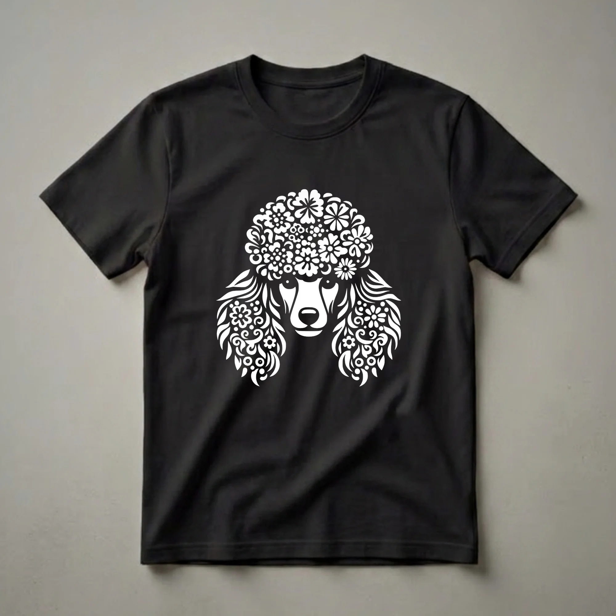 Poodle owners who appreciate artistic flair will reach for this eye-catching t-shirt. The design features a stylized poodle face, rendered entirely in white against a contrasting background. Instead of traditional fur, the poodle's head and ears are adorned with an intricate arrangement of flowers, swirls, and delicate leaf patterns. This unique artistic interpretation transforms a beloved dog breed into a wearable piece of art. Poodles, known for their intelligence and distinctive curly coats, are celebrated here with a creative floral twist. This graphic tee is a thoughtful gift for any poodle mom or dad, celebrating their special bond with their canine companion. It's a fantastic choice for casual outings, dog park visits, or simply relaxing at home with your furry friend. The striking white-on-black design ensures this shirt stands out, making it a go-to tee for expressing your passion for poodles. This apparel is a staple in the collection for any devoted poodle enthusiast.