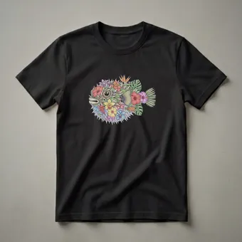 - A unique floral pufferfish graphic tee for marine life enthusiasts.