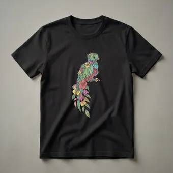Birdwatchers who dream of spotting a Resplendent Quetzal in the misty cloud forests of Guatemala or Costa Rica will reach for this graphic tee. The design features a stunning illustration of the Quetzal rendered entirely in flowers and leaves: the bird's body, wings, and extraordinarily long tail feathers are built from tropical hibiscus blooms in red and orange, yellow flowers, pink blossoms, and layers of green leaves in multiple shades. The bird's green crest, black eye, and orange bill are clearly identifiable at the top of the composition, while the tail, which can reach up to three feet in length on adult males, flows downward in a cascade of botanical color that fills the lower half of the shirt. The Resplendent Quetzal (Pharomachrus mocinno) is considered one of the most visually spectacular birds in the world. It inhabits the highland cloud forests of Central America from southern Mexico to western Panama, living at elevations between 4,000 and 10,000 feet. The Quetzal holds deep cultural significance in Mesoamerican history, it was sacred to both the Maya and Aztec civilizations, whose rulers wore quetzal feathers as symbols of divine power. The bird is the national symbol of Guatemala and appears on the country's flag and currency. This shirt makes a thoughtful gift for birdwatchers, tropical birders, ornithology enthusiasts, nature illustrators, and anyone who appreciates the intersection of botanical art and avian subjects. Wear it to a nature center, a birdwatching outing in Central America, or any casual day when you want a shirt that functions as wearable art.