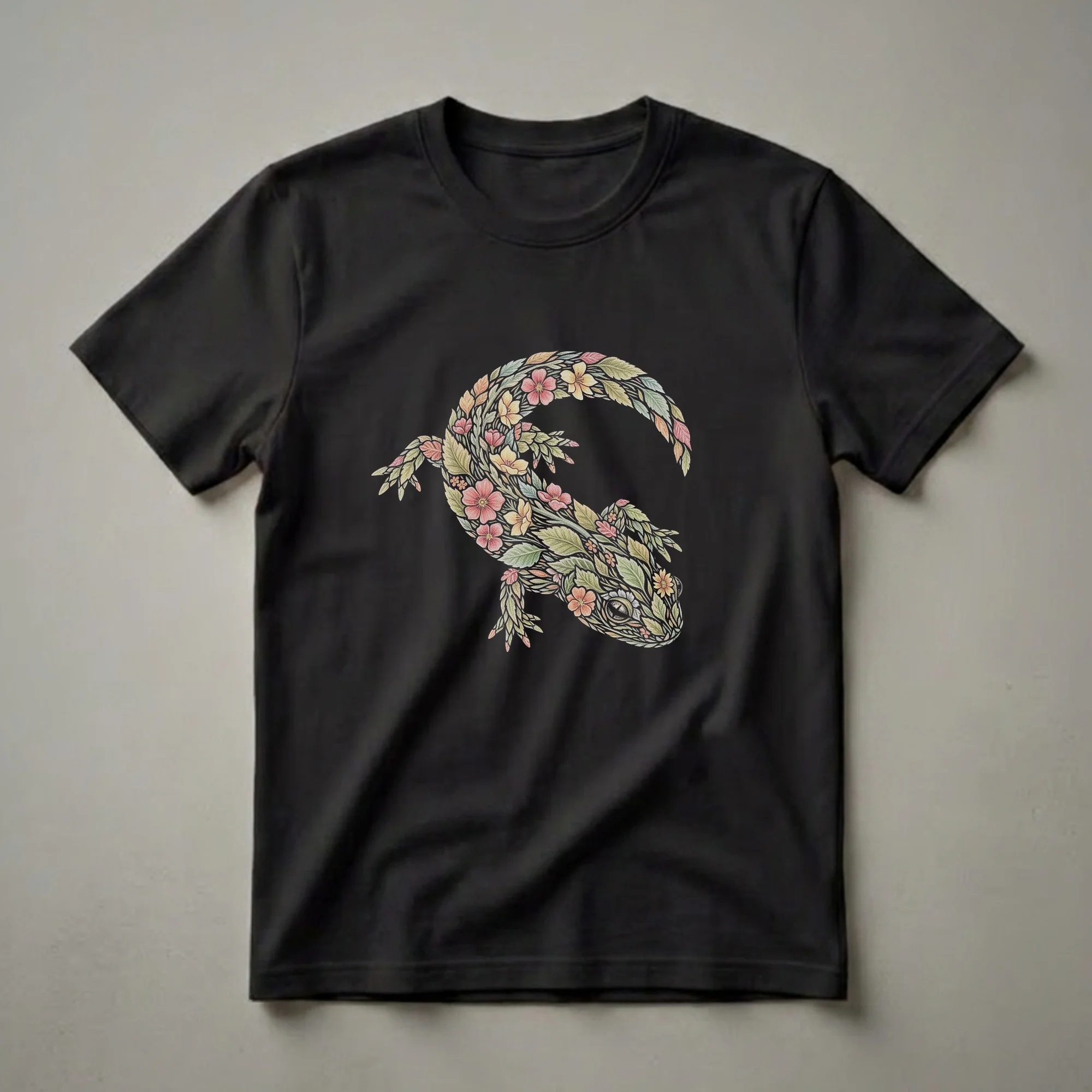 Nature lovers and reptile enthusiasts will appreciate this striking t-shirt featuring a salamander artfully constructed from a vibrant array of flowers and leaves. The intricate design showcases delicate petals in shades of pink, yellow, and coral, interspersed with lush green foliage, all meticulously arranged to form the distinct shape of a salamander. This unique graphic tee captures the essence of the natural world, blending the beauty of flora with the fascinating form of a reptile. Salamanders are amphibians known for their moist skin and often secretive habits, inhabiting damp environments like forests, streams, and caves across various continents. This shirt serves as a wearable piece of art, a thoughtful choice for anyone who admires the intricate details of both botanical illustrations and the diverse creatures of the wild. It makes a thoughtful gift for her, especially for someone who enjoys hiking, wildlife observation, or simply appreciates unique, nature-inspired apparel. Wear this eye-catching tee to your next nature walk or casual outing to showcase your love for the outdoors and its inhabitants.
