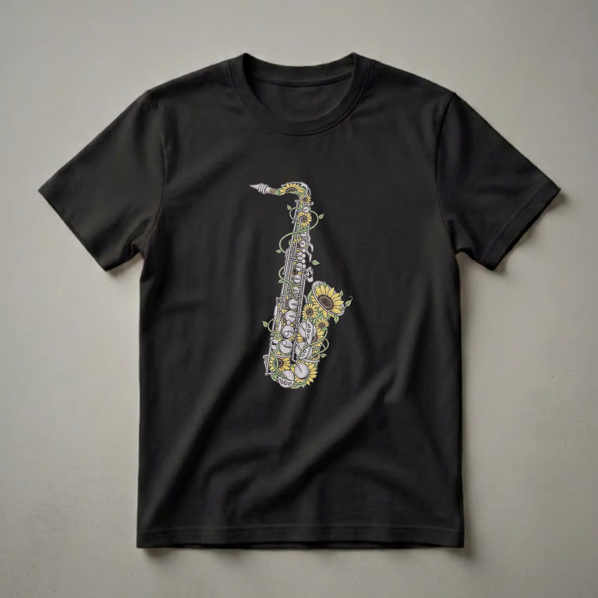 Musicians who play the saxophone will appreciate this artistic tee featuring a detailed drawing of the instrument. The saxophone, a member of the woodwind family known for its rich, versatile tone, is intricately depicted here, adorned with vibrant sunflowers and winding green vines. This design captures a unique blend of musical passion and natural beauty, making it a striking addition to any wardrobe. The saxophone itself, with its complex key system and iconic shape, is rendered in a sketch-like style, giving it an artistic and slightly vintage feel. Sunflowers, symbols of adoration and loyalty, bloom around the instrument, adding a cheerful and organic element. This shirt is a thoughtful gift for saxophonists, band students, or anyone who finds joy in playing or listening to this beloved instrument. It's a great conversation starter at band practice, music lessons, or casual gatherings. Wear this tee to express your musical identity and appreciation for artful design.