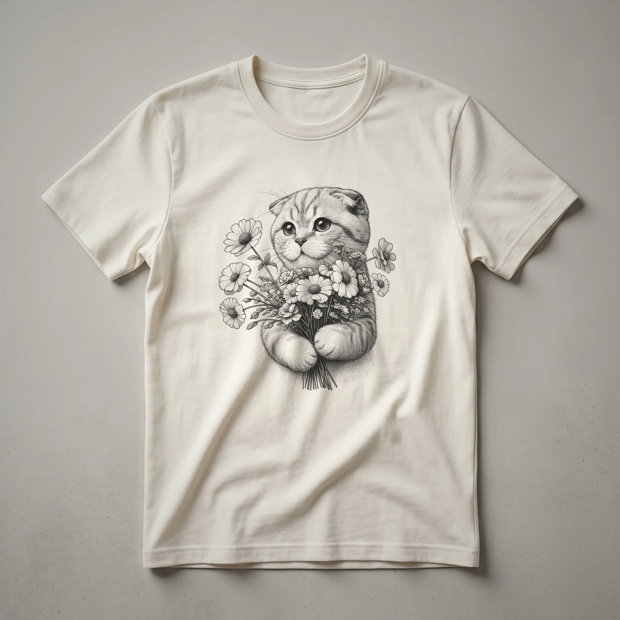 Cat moms and cat dads who cherish their feline companions will adore this striking graphic tee. The design features the distinctive face of a Scottish Fold cat, known for its folded ears and sweet expression, artfully surrounded by a delicate floral arrangement. This shirt serves as a beautiful memorial for a cherished pet, a way to keep their memory close. Scottish Folds are a breed originating from Scotland, recognized for their unique physical traits and gentle, affectionate nature. They often form deep bonds with their owners, making the loss of one particularly poignant. This t-shirt is more than just apparel; it's a wearable tribute to the unconditional love and joy a cat brings into our lives. It makes a thoughtful gift for anyone who has experienced the special connection with a Scottish Fold or any beloved cat. Wear this tee to casual outings, cat-themed events, or simply around the house as a constant reminder of your furry friend. This comfortable shirt is a staple in the collection for any devoted cat lady or gentleman.