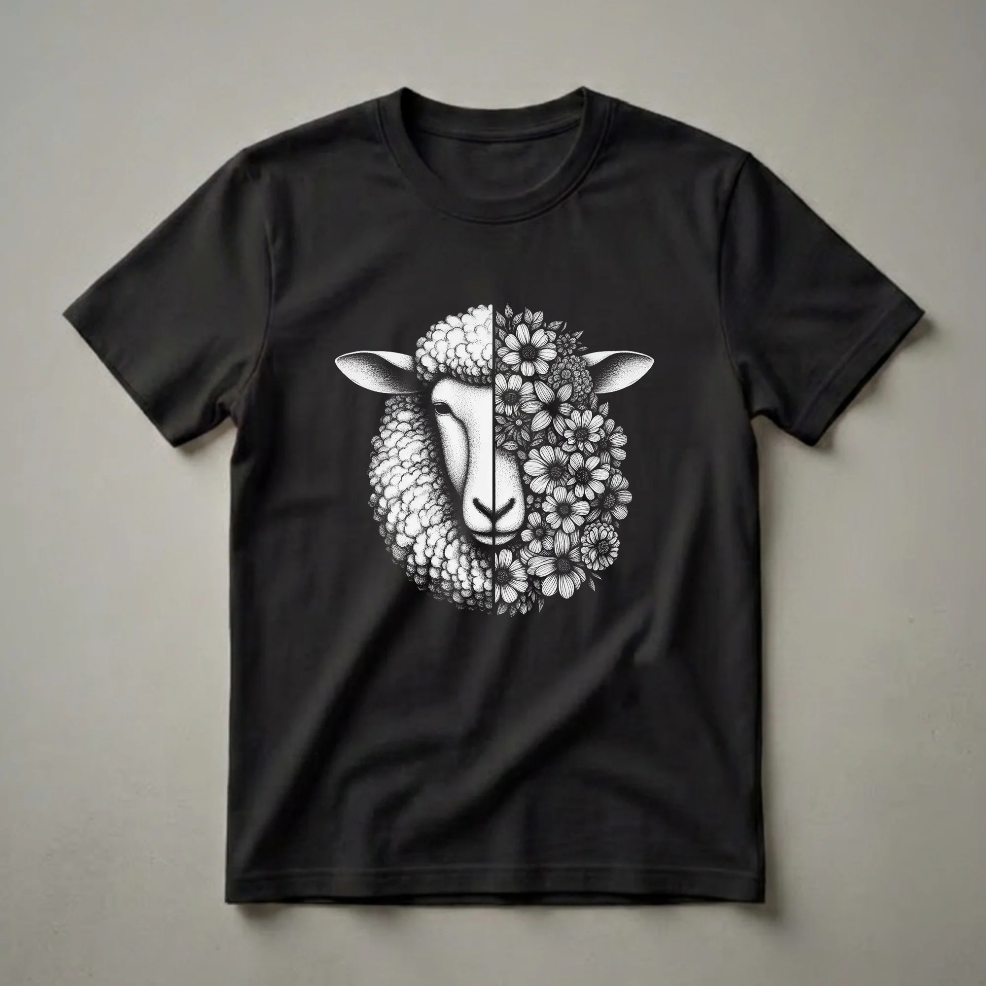 Nature lovers and admirers of unique wildlife art will reach for this eye-catching graphic tee. The design features a striking stippled illustration of a sheep's head, artfully divided down the center. One side of the sheep's face is rendered with the intricate texture of its wool, created through detailed dot work. The other half transforms into a beautiful arrangement of blooming flowers and delicate leaves, showcasing a harmonious blend of fauna and flora. This artistic representation captures the gentle spirit of sheep, often found grazing in meadows and rolling hills across various continents, including Europe and Asia. This t-shirt makes a thoughtful gift for women and girls who have a deep appreciation for the natural world, farm animals, or distinctive artistic expressions. It's a wonderful conversation starter, great to wear on nature walks, to casual gatherings, or simply when you want to express your connection to the outdoors. The detailed linework and contrasting textures make this shirt a standout piece in any wardrobe, celebrating the beauty found in both the animal kingdom and the botanical world.