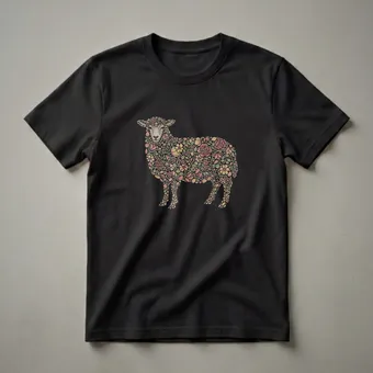 Wildlife enthusiasts and lovers of unique art will appreciate this striking graphic tee featuring a sheep rendered entirely from a detailed floral drawing. The design showcases a stylized sheep silhouette filled with an intricate pattern of blooming flowers, leaves, and vines in muted tones of red, yellow, and green. This artistic representation brings a touch of natural beauty and vintage charm to your wardrobe. Sheep, known for their gentle nature and their role in agriculture for wool and meat, are found in diverse habitats worldwide, often grazing in meadows and pastures. This t-shirt works well for anyone who appreciates the pastoral aesthetic or the symbolism of sheep in art and culture. It makes a thoughtful gift for nature lovers, hikers, or those who enjoy unique, artistic apparel. Wear this eye-catching shirt to your next outdoor adventure or casual gathering to spark conversations about art and the natural world. This comfortable tee is a staple in the collection for those who want to express their connection to the animal kingdom.