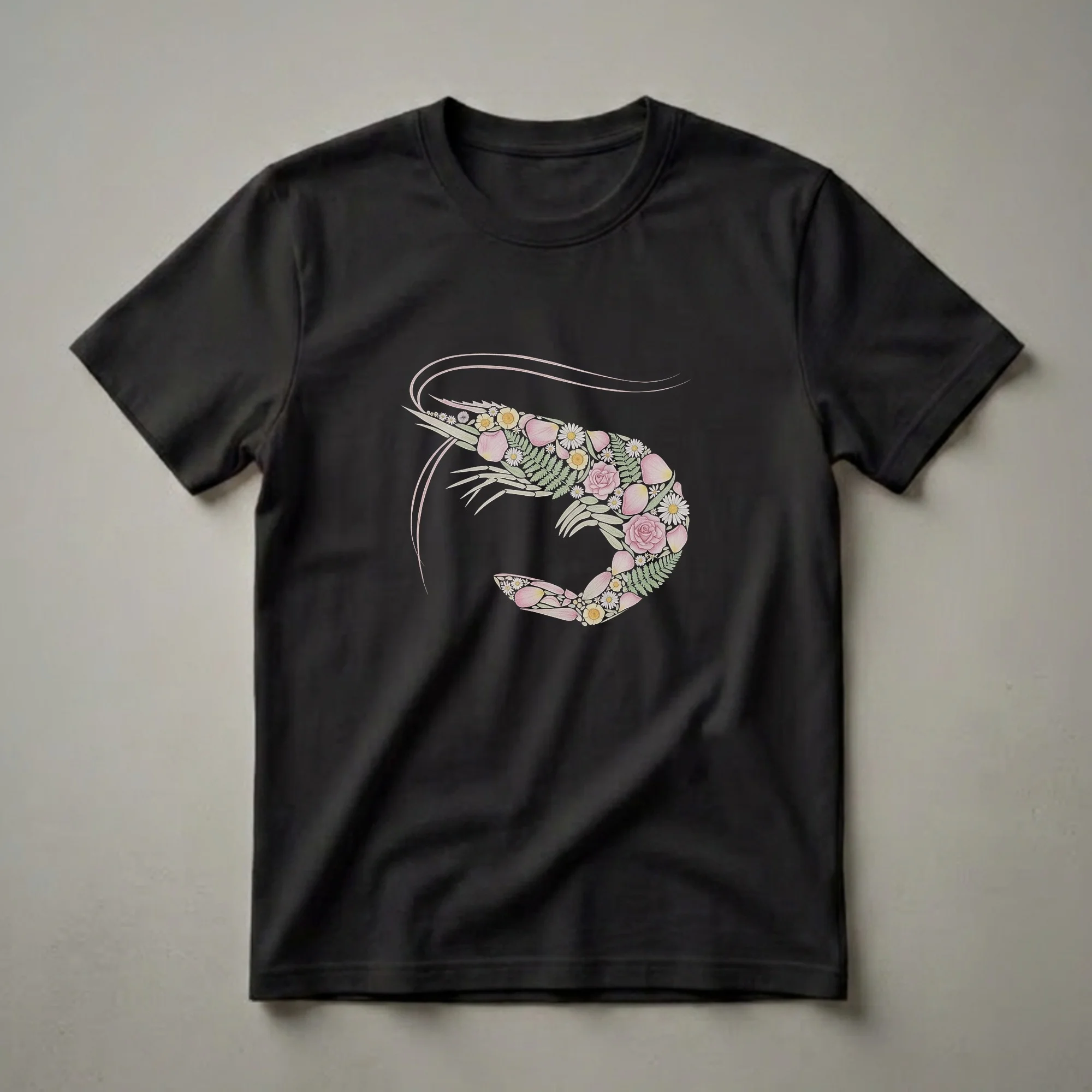 Marine life enthusiasts and lovers of unique art will appreciate this striking t-shirt featuring a detailed watercolor illustration of a shrimp. The entire crustacean form is artfully constructed from a vibrant arrangement of delicate flowers, including roses and daisies, interspersed with lush fern fronds and soft petals. This eye-catching design reimagines the familiar shape of a prawn with a whimsical, botanical twist. Shrimp are decapod crustaceans found in marine and freshwater environments worldwide, known for their distinctive swimming posture and role in aquatic ecosystems. This tee works well for anyone who appreciates the beauty of the ocean and the intricate details of floral artistry. It makes a thoughtful gift for nature lovers, artists, or anyone seeking a distinctive piece of apparel that stands out. Wear this shirt to a casual outing, a visit to an aquarium, or simply when you want to showcase your unique style.