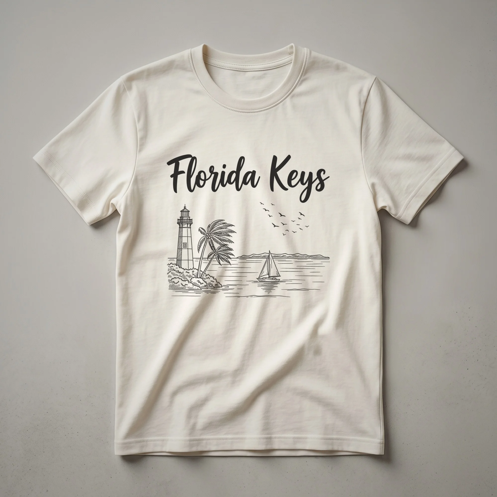Florida Keys travelers who cherish the unique island chain will reach for this distinctive graphic tee. The design captures the essence of the Keys with a classic lighthouse standing guard over a tropical shoreline, complete with swaying palm trees. A lone sailboat glides across the water, evoking the laid-back atmosphere and maritime charm that defines this string of islands. The words 'Florida Keys' are elegantly scripted above the scene, making it clear where your heart lies. This t-shirt is more than just apparel; it's a wearable postcard from paradise. The Florida Keys, a coral archipelago stretching from the southeastern tip of Florida, are renowned for their vibrant marine life, stunning sunsets, and relaxed island vibe. This shirt serves as a constant reminder of sunny days, ocean breezes, and the unique culture found only in this part of the Sunshine State. It makes a thoughtful gift for anyone who has experienced the magic of Key West, Marathon, or Islamorada, or for those dreaming of their next visit. Wear this tee to your next beach gathering, casual outing, or while reminiscing about your favorite Florida vacation.