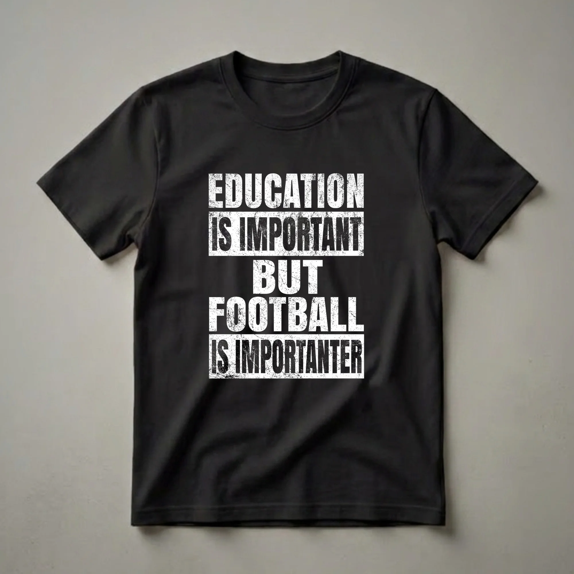- Features distressed white text: 'EDUCATION IS IMPORTANT BUT FOOTBALL IS IMPORTANTER'.