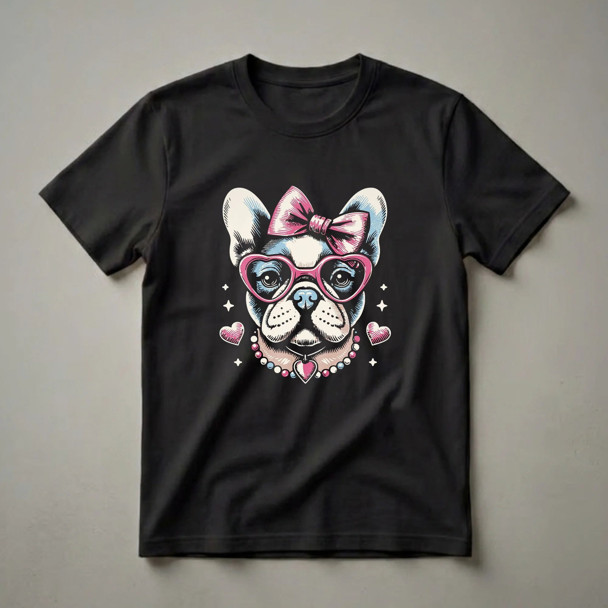 - Features a stylish French Bulldog wearing a bow and heart glasses.