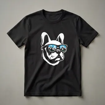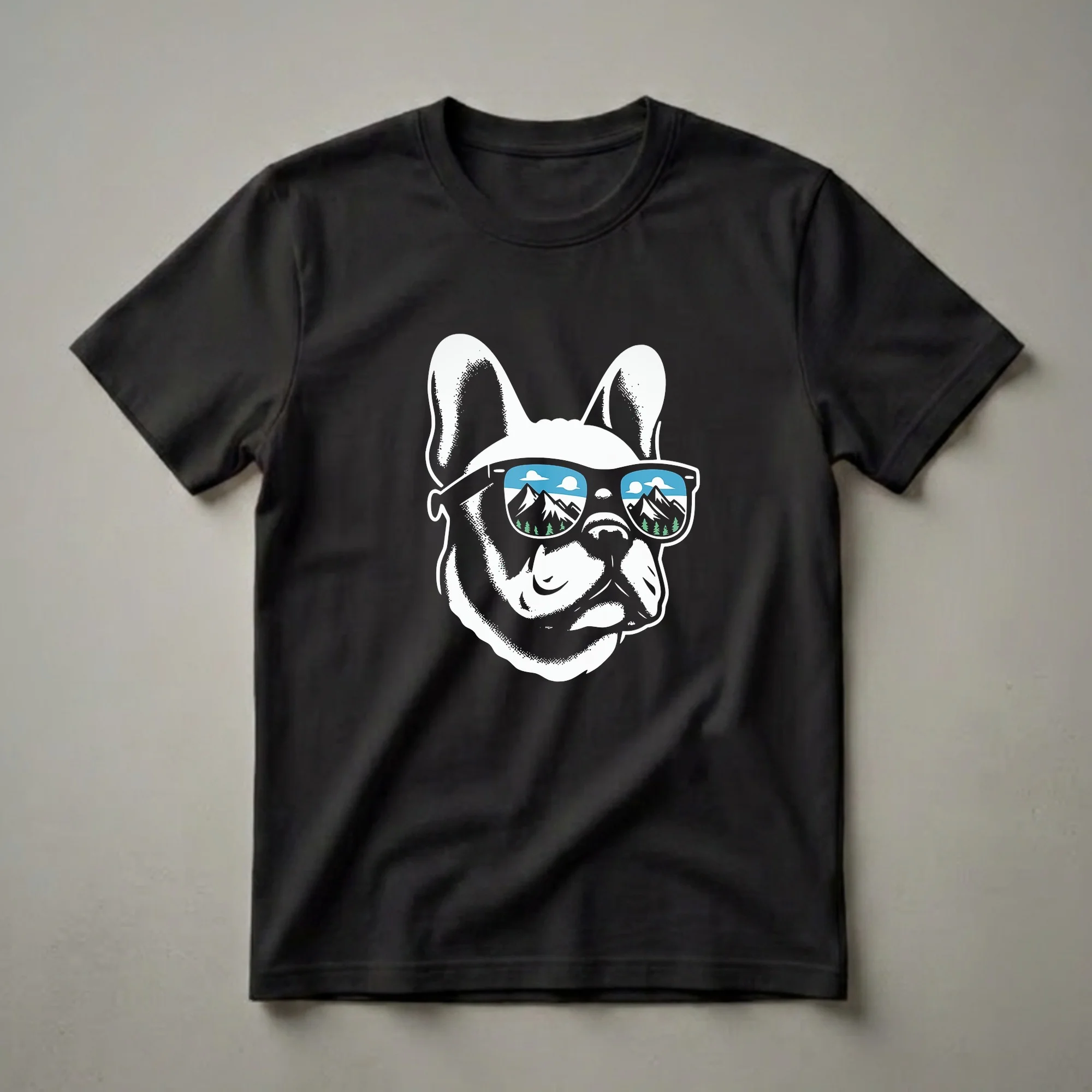 - Graphic tee featuring a French Bulldog wearing sunglasses with a mountain reflection.