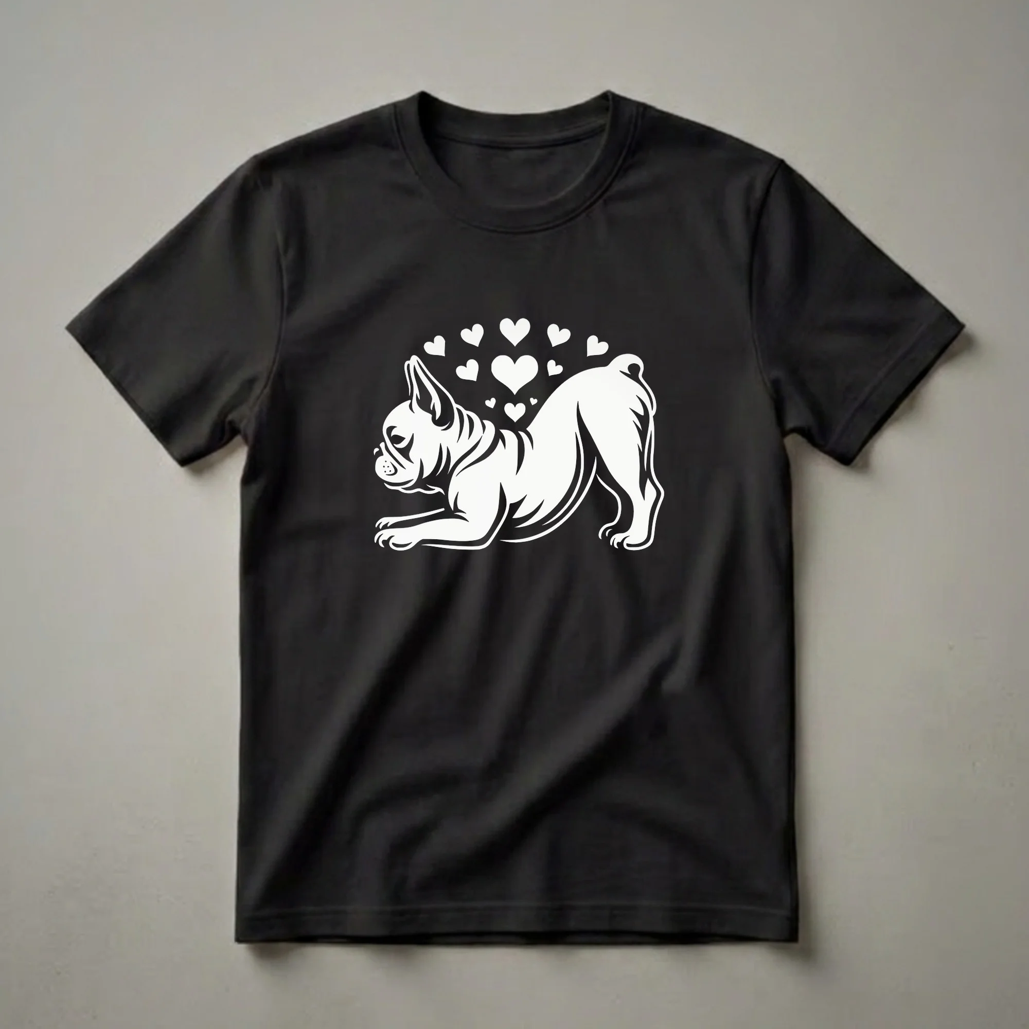 French Bulldog enthusiasts who appreciate a good stretch will adore this eye-catching graphic tee. The design features a white silhouette of a French Bulldog in a downward-facing dog yoga pose, with a playful arrangement of white hearts floating above its back. French Bulldogs, known for their distinctive bat ears and affectionate nature, are a beloved breed often cherished for their clownish personalities and compact build. This shirt captures the breed's charm and a touch of zen, making it a go-to tee for yoga practitioners and dog lovers alike. It's a thoughtful gift for the Frenchie owner in your life, whether they practice yoga or simply love their canine companion. Wear this t-shirt to your next yoga class, a casual outing with friends, or while relaxing at home with your furry friend. This unique apparel celebrates the bond between humans and their French Bulldogs, offering a stylish way to express your passion for these wonderful dogs. The striking white-on-black design ensures the artwork stands out, making it a conversation starter among fellow dog aficionados. This tee is a staple for anyone who wants to showcase their French Bulldog pride with a touch of whimsy and a nod to their wellness routine.