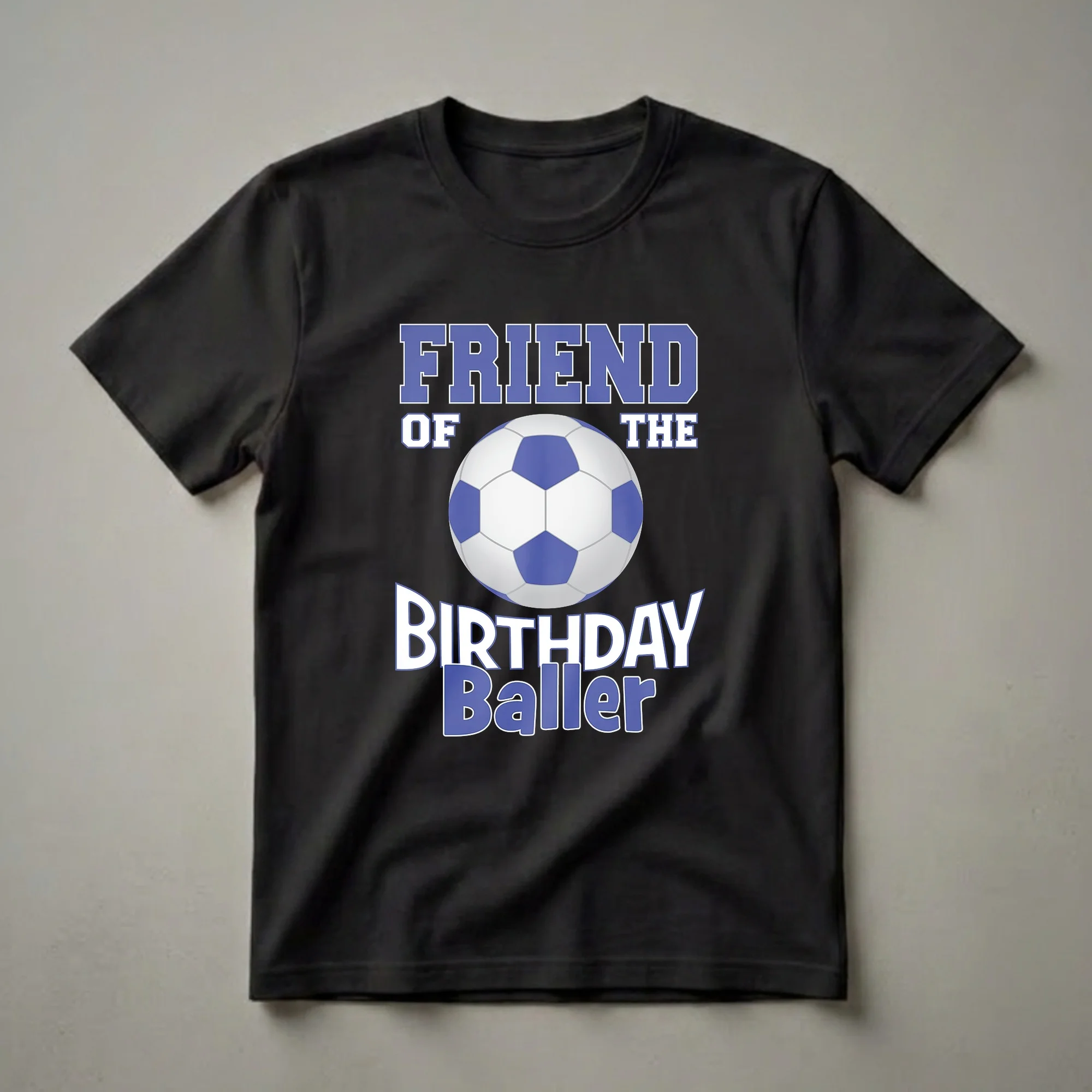 - Friend of the Birthday Baller soccer t-shirt for party guests.