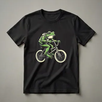 Embrace whimsical charm with this graphic art t-shirt featuring a dapper frog pedaling a bicycle on a bold black background. The design features a vibrant green frog, anthropomorphically dressed in a cool green jacket and white shirt, confidently riding a bicycle. The art style is bold and graphic, with strong linework and a limited color palette of green and off-white against a stark black background, giving it a retro yet modern feel. Frogs, known for their incredible agility and ability to leap great distances, are fascinating amphibians found in diverse habitats worldwide, from lush rainforests to serene ponds. This shirt captures a playful spirit, imagining a frog enjoying a common human activity. It's a thoughtful gift for anyone who loves unique animal designs, cycling, or simply enjoys a good chuckle. This t-shirt works well for casual outings, bike rides, or just lounging at home. Wear it to express your unique style and appreciation for the unexpected. This graphic shirt is a conversation starter and a fun addition to any wardrobe.