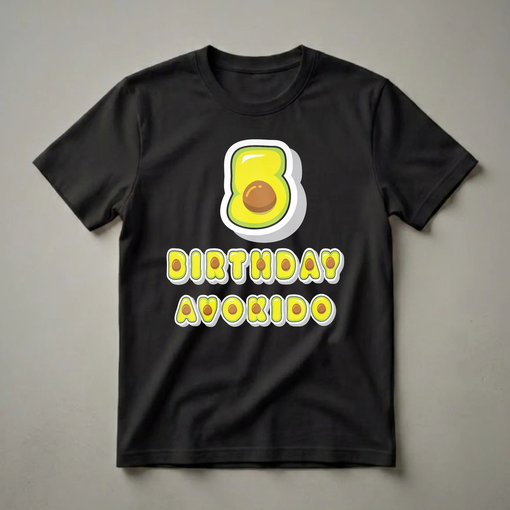 This playful t-shirt celebrates a fifth birthday with a unique 'Avokido' design. The graphic prominently features the number 5, creatively rendered as a halved avocado with its brown pit clearly visible. The pit is stylized with a subtle shine, and the creamy yellow-green flesh of the avocado is depicted with vibrant colors and a glossy finish. Below the number, the words "BIRTHDAY AVOKIDO" are written in bold, rounded block letters. Each letter is designed to mimic the appearance of an avocado slice, complete with the characteristic green rind and yellow interior, and many of them also showcase the brown pit. This fun and quirky shirt is a wonderful way to commemorate a child turning five. Avocados are a popular and nutritious fruit, enjoyed globally for their creamy texture and versatility in various dishes. This tee is tailored for a child reaching the milestone age of five years old, a time of significant growth and discovery. It makes a thoughtful gift for any 5-year-old who loves unique and humorous designs. This shirt is great to wear to a birthday party, family gatherings, or just for everyday fun.