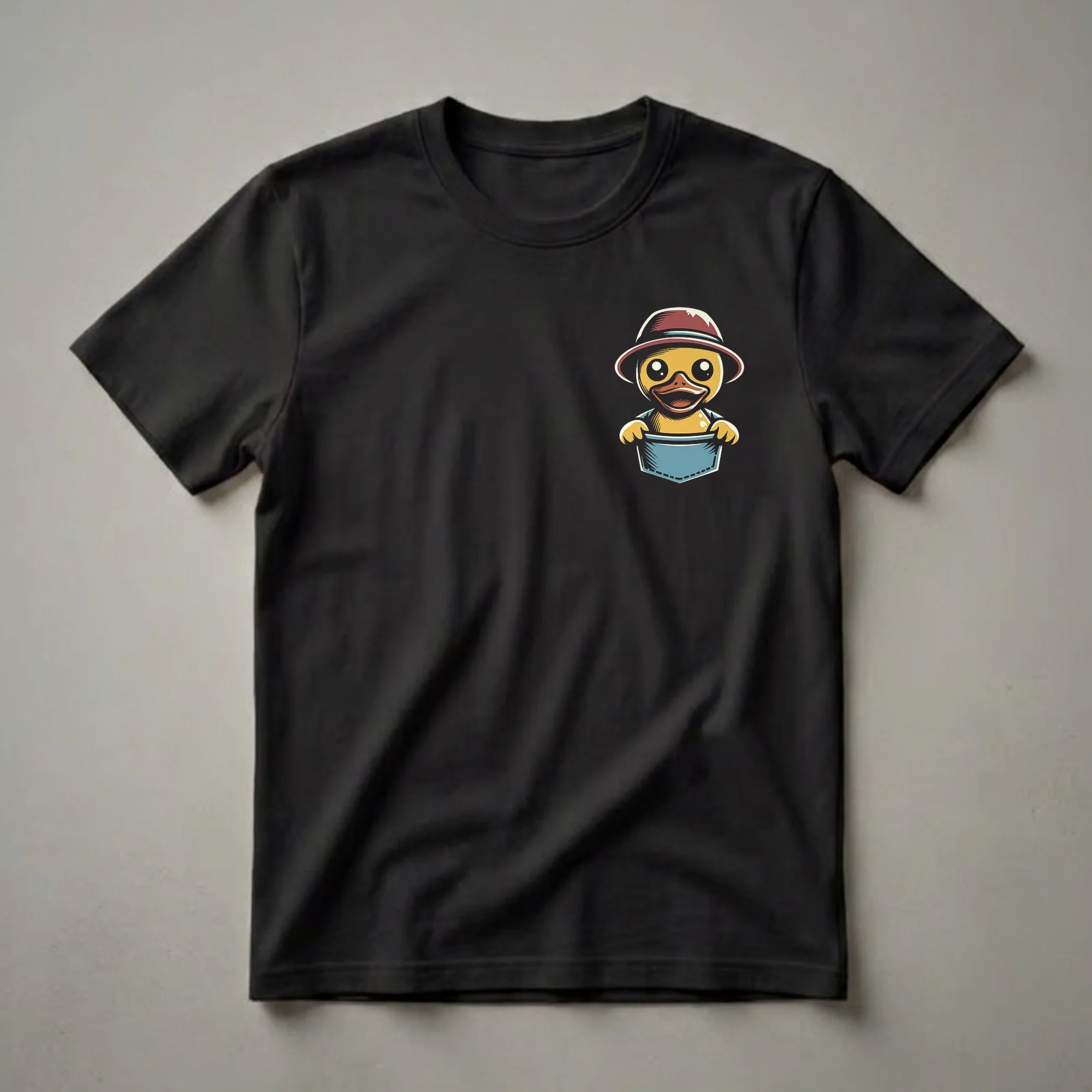 This eye-catching graphic tee showcases a charming baby duck, complete with a jaunty hat and wide, curious eyes, peeking out from a blue pocket. The art style is bold and cartoonish, with strong outlines and vibrant colors that make the little duck pop. Ducks, known for their playful nature and association with water, are a beloved symbol of joy and lightheartedness. This particular design captures that whimsical spirit, presenting a duck that seems to be playfully hiding or observing the world. It's a delightful piece of apparel that brings a smile to your face. This t-shirt works well for anyone who appreciates animal humor or enjoys quirky, conversation-starting graphics. It makes a thoughtful gift for friends or family members who have a fondness for ducks or simply love a good chuckle. Wear this shirt to casual outings, game nights, or just around the house to spread a little cheer. The playful design is sure to be a hit with those who enjoy lighthearted and amusing clothing.