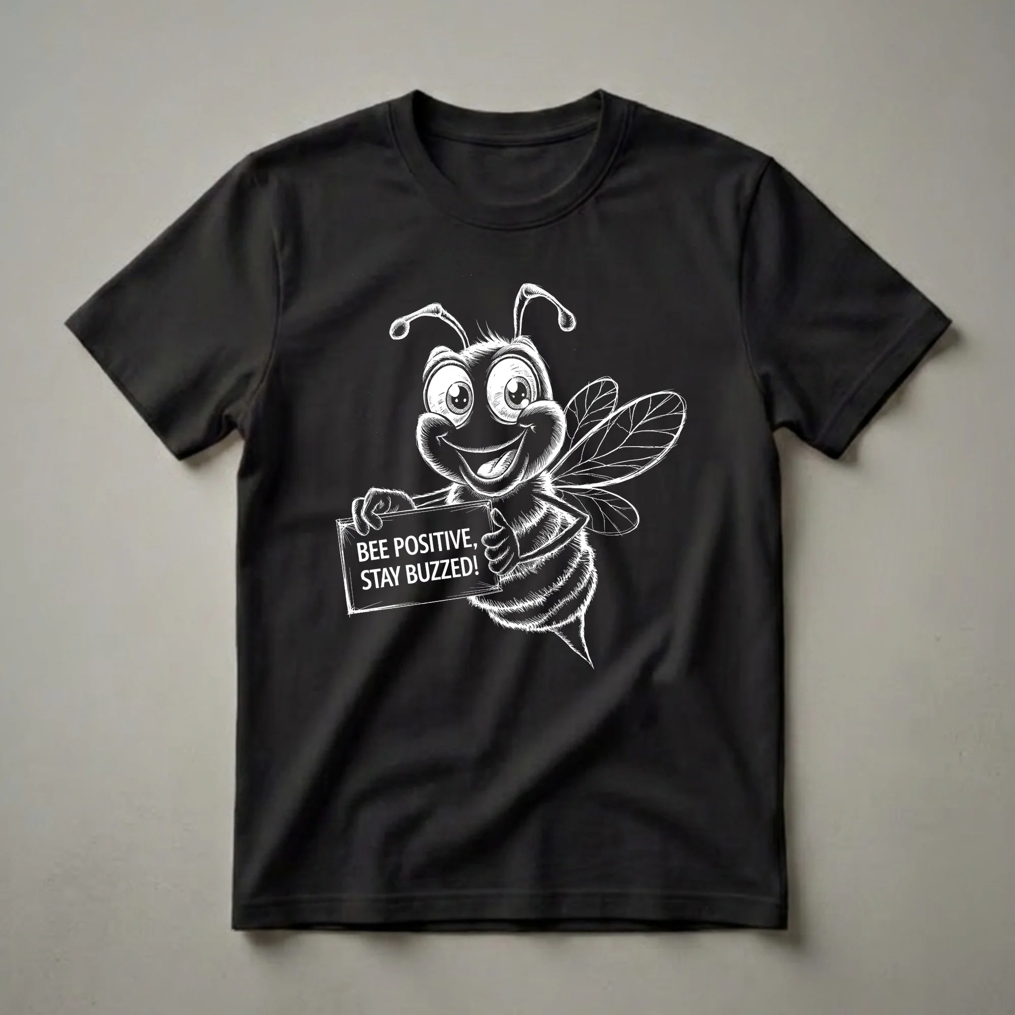 This eye-catching graphic tee showcases a whimsical cartoon bee rendered in a bold, sketchy black and white style. The bee has large, expressive eyes, a wide smile, and fuzzy stripes, giving it a friendly and slightly manic appearance. It holds a sign in its hand that reads "BEE POSITIVE, STAY BUZZED!". This playful design is a thoughtful choice for anyone who appreciates a good pun and a dose of humor. Bees, as vital pollinators, play a crucial role in our ecosystem, contributing to the production of fruits, vegetables, and nuts. Their industrious nature and the sweet reward of honey have made them a symbol of hard work and sweetness for centuries. This shirt is a thoughtful gift for friends, family members, or colleagues who enjoy a lighthearted message and a unique graphic. It's a go-to tee for casual outings, game nights, or simply lounging around the house. Wear this shirt to bring a smile to people's faces and spread a little positivity wherever you go. It’s a fun way to express your appreciation for nature's busy workers and a good chuckle.