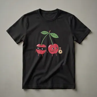 Showcasing a mischievous cherry bandit and its accomplice, this tee offers a humorous take on fruit and dark comedy for those with a taste for the unexpected. The design showcases two anthropomorphic cherries with a playful, dark twist. One cherry is depicted as a classic burglar, complete with a black eye mask and a determined expression, ready for a heist. Beside it, another cherry sports a sly grin, clutching a small burlap money bag, hinting at a successful, albeit fruity, caper. Above them, two green leaves and a brown stem connect them, adding a touch of natural contrast to the whimsical scene. This shirt is a thoughtful gift for anyone who enjoys a good pun or a bit of dark humor, especially those who work in the food industry or simply have a passion for culinary arts. It’s a conversation starter, a thoughtful choice for casual outings, game nights, or just lounging at home. The playful yet edgy design makes this t-shirt a unique addition to any wardrobe, appealing to those with a taste for the unconventional. Cherries, known for their sweet flavor and vibrant color, are transformed here into characters with a mischievous streak, offering a fresh perspective on fruit-themed apparel.