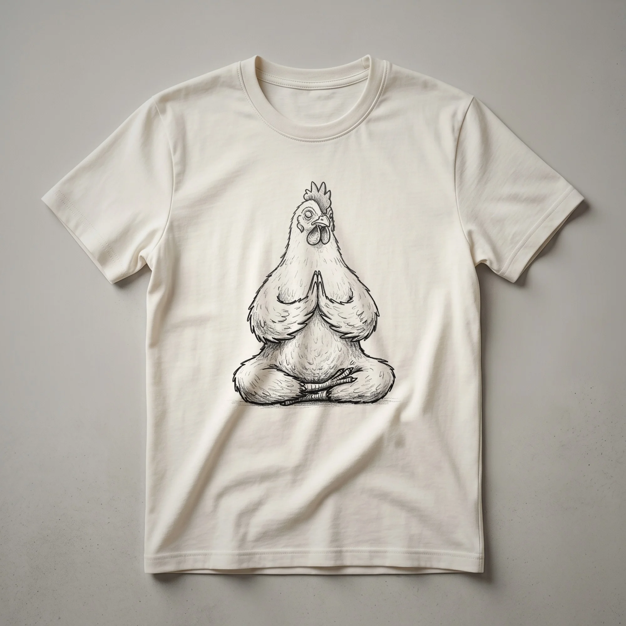 A whimsical chicken is depicted in a serene yoga pose, embodying the principles of meditation and Buddhist Zen. This graphic tee is suited for individuals who find humor in their fitness journey and appreciate the calming practice of yoga. The artwork showcases a stylized chicken, perhaps a Rhode Island Red given its common depiction, in a seated meditation posture, eyes closed, radiating tranquility. This shirt is a playful nod to the dedication required for mindfulness and the pursuit of inner balance, whether you're a seasoned yogi or just starting your journey. It’s a staple in the collection for those who believe that a little humor can enhance any wellness routine. This t-shirt works well for anyone who enjoys a good laugh while striving for a more centered life. It makes a thoughtful gift for friends or family members who practice yoga, meditation, or simply appreciate quirky, animal-themed apparel. Wear this tee to your next yoga class, meditation retreat, or casual outing to share a smile and spread a little Zen.
