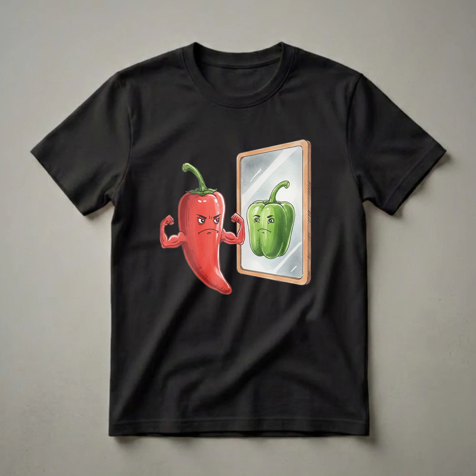 Vegetable lovers who appreciate a good pun will reach for this eye-catching graphic tee. The design showcases a red chili pepper with a determined expression, flexing its muscular arms in front of a mirror. In the reflection, a green bell pepper looks back with a similar, yet slightly more subdued, expression. This humorous visual plays on the idea of peppers wanting to be strong or perhaps the contrast between different types of peppers. Capsicum annuum, the species that includes both chili peppers and bell peppers, is native to the Americas and is a staple in cuisines worldwide. This shirt is a thoughtful gift for anyone who enjoys a good laugh, especially those who love cooking, gardening, or simply appreciate quirky food-related humor. It's a fun conversation starter, worn by those who enjoy casual outings, game nights, or just lounging around. Wear this tee to express your playful side and share a smile with others who get the joke.