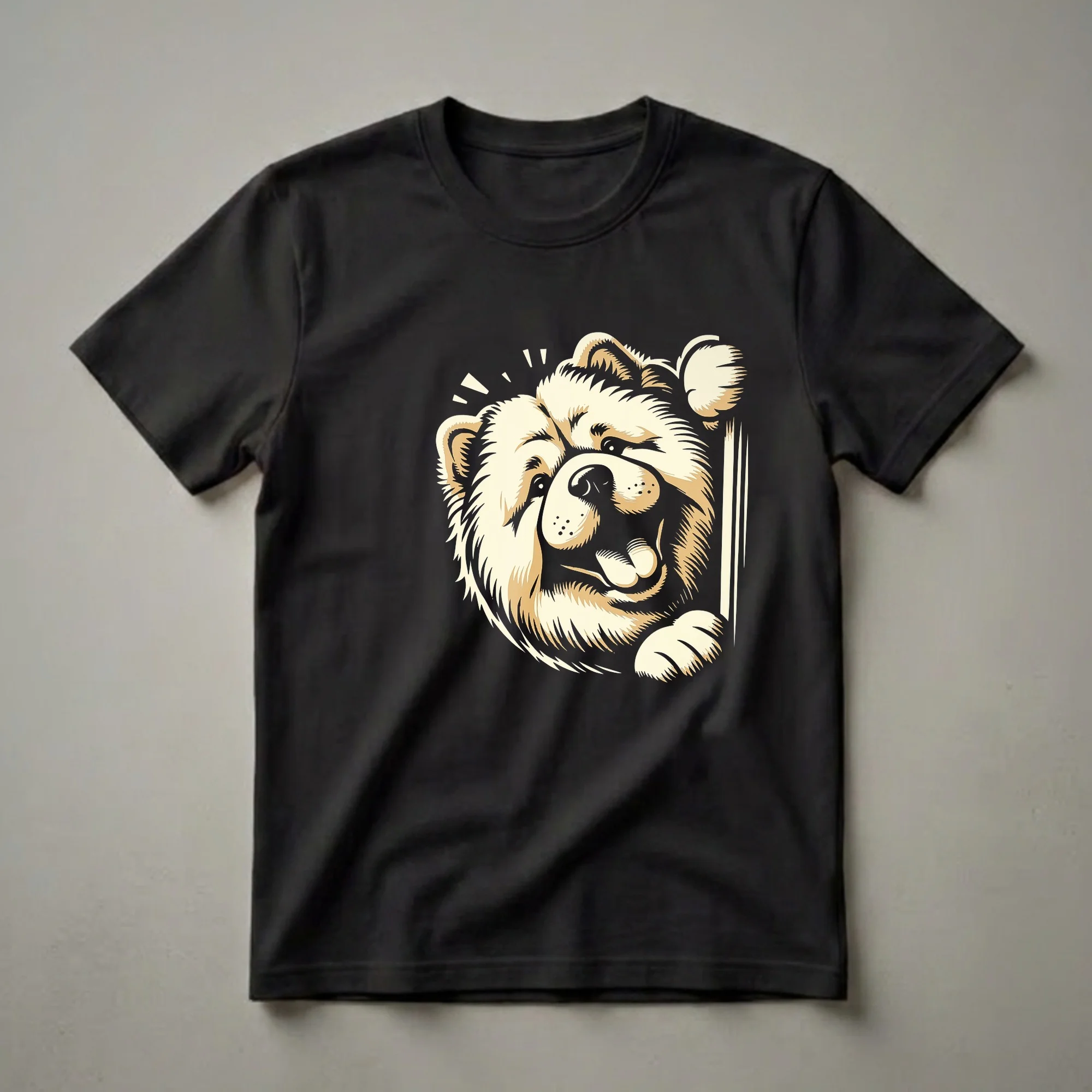 - This tee showcases a stylized cream and tan Chow Chow peeking from a black background.