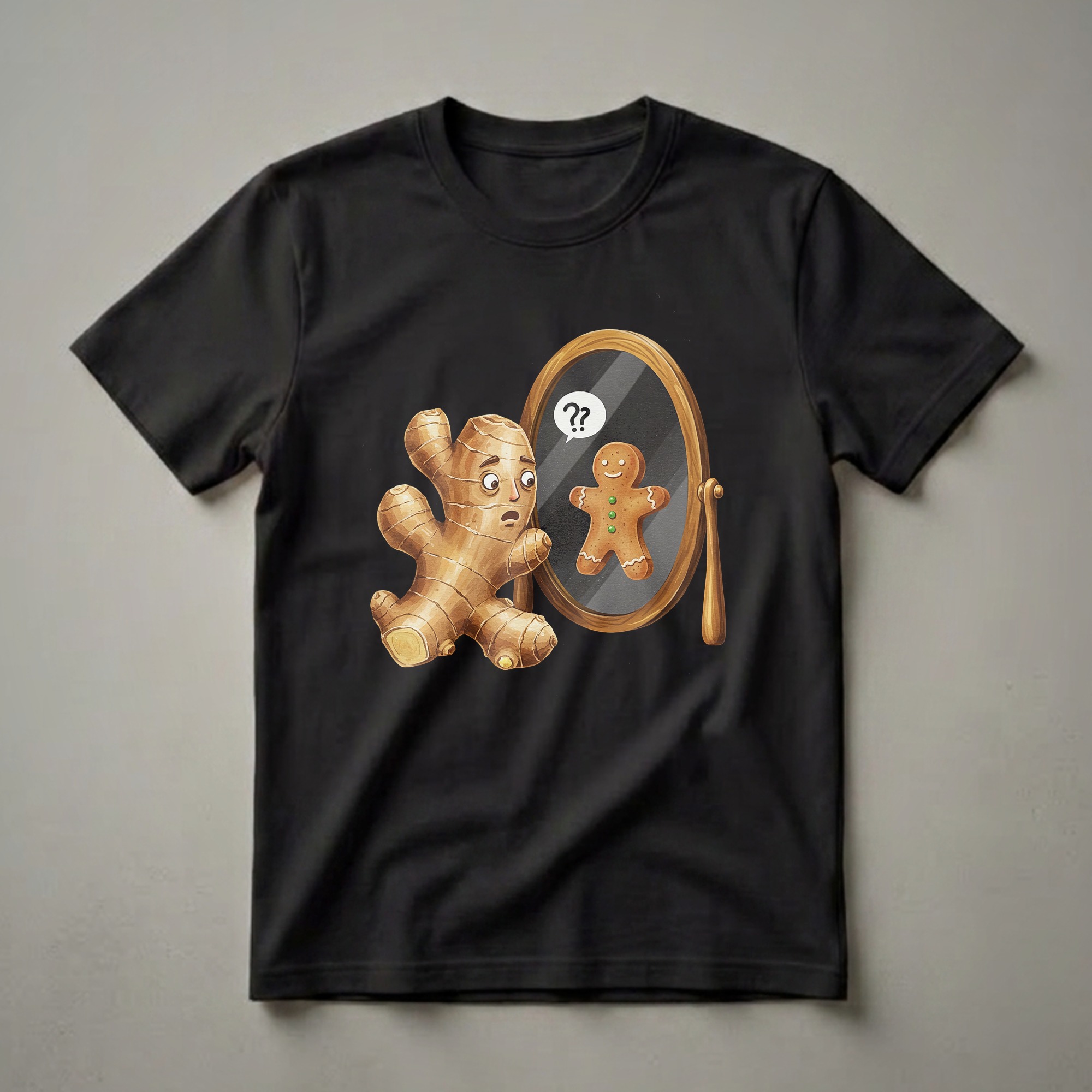 Ginger root, with its knobby texture and earthy tones, stands before an ornate wooden mirror, its wide eyes expressing bewilderment. A speech bubble above its head contains two question marks, highlighting its confusion. In the mirror's reflection, a cheerful gingerbread man with green candy buttons and a wavy icing smile gazes back. This whimsical design captures a moment of unexpected transformation, a thoughtful choice for those who appreciate a bit of quirky humor during the holiday season. Ginger, a spice known for its pungent flavor and warming properties, is a staple in many holiday baked goods, including gingerbread cookies. This graphic tee is a playful nod to that connection, imagining a scenario where the root itself is surprised by its cookie counterpart. It's a thoughtful gift for anyone who enjoys a unique and humorous take on Christmas traditions. Wear this shirt to holiday parties, family gatherings, or casual outings to spread some festive cheer and elicit a chuckle. This t-shirt is a conversation starter, well suited for those who love to express their personality through their clothing.