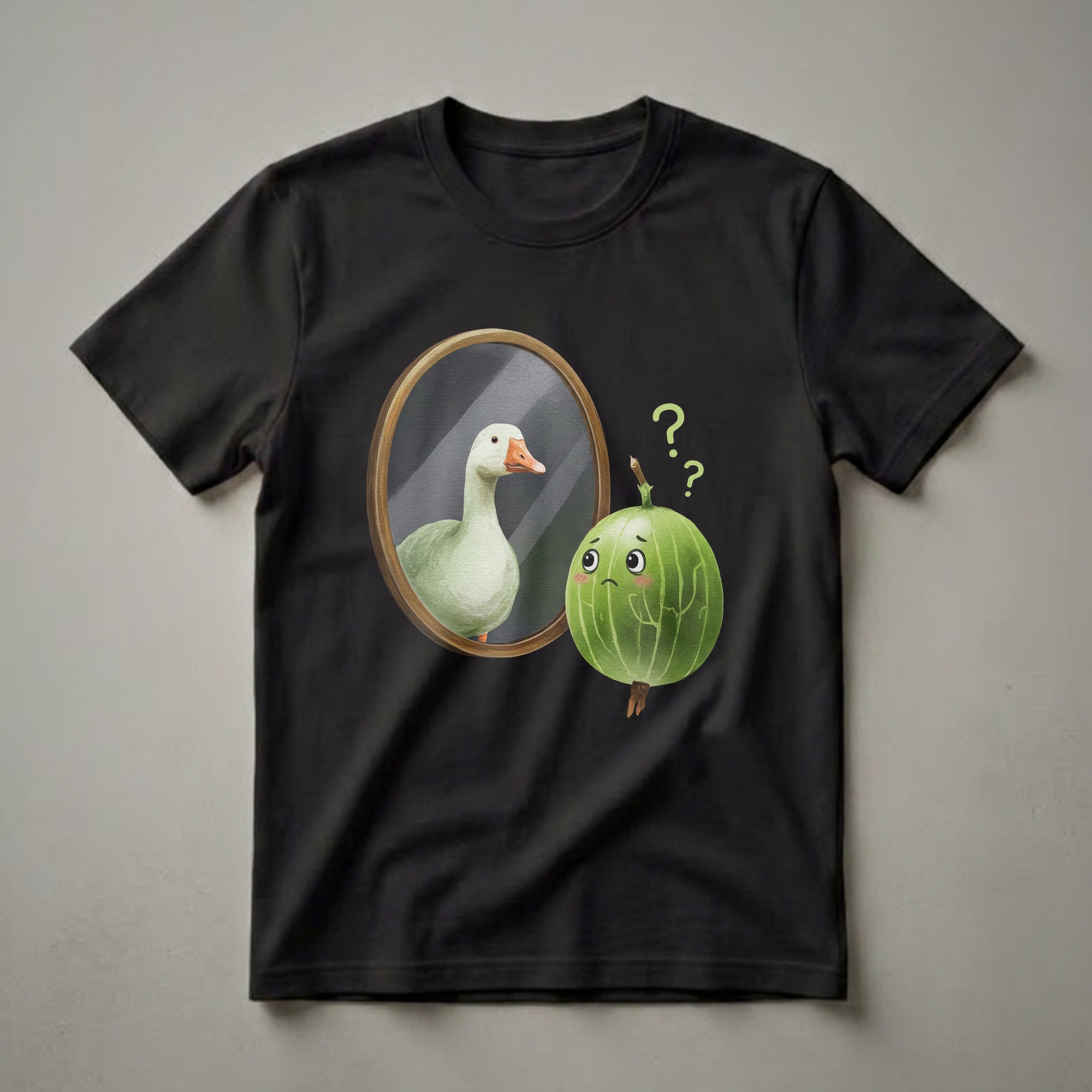 This eye-catching graphic tee showcases a whimsical scene that will bring a smile to anyone's face. The artwork features a plump, green gooseberry with a confused expression, complete with blushing cheeks and question marks floating above its head. It's looking into a round, wooden-framed mirror, which reflects the image of a white goose. This playful design taps into the humor of mistaken identity or perhaps an existential crisis for a fruit. Gooseberries, known for their tart flavor and fuzzy skin, are often used in pies and jams, but this tee gives them a personality all their own. Geese, on the other hand, are known for their distinctive honk and sometimes assertive nature. This shirt is a thoughtful gift for friends who appreciate quirky humor, fruit puns, or simply enjoy a good laugh. It's a staple in the collection for anyone who loves to wear their sense of humor. This t-shirt works well for casual outings, game nights, or just lounging around the house. It’s a conversation starter that’s sure to get a chuckle from fellow fans of funny animal and food-themed apparel.