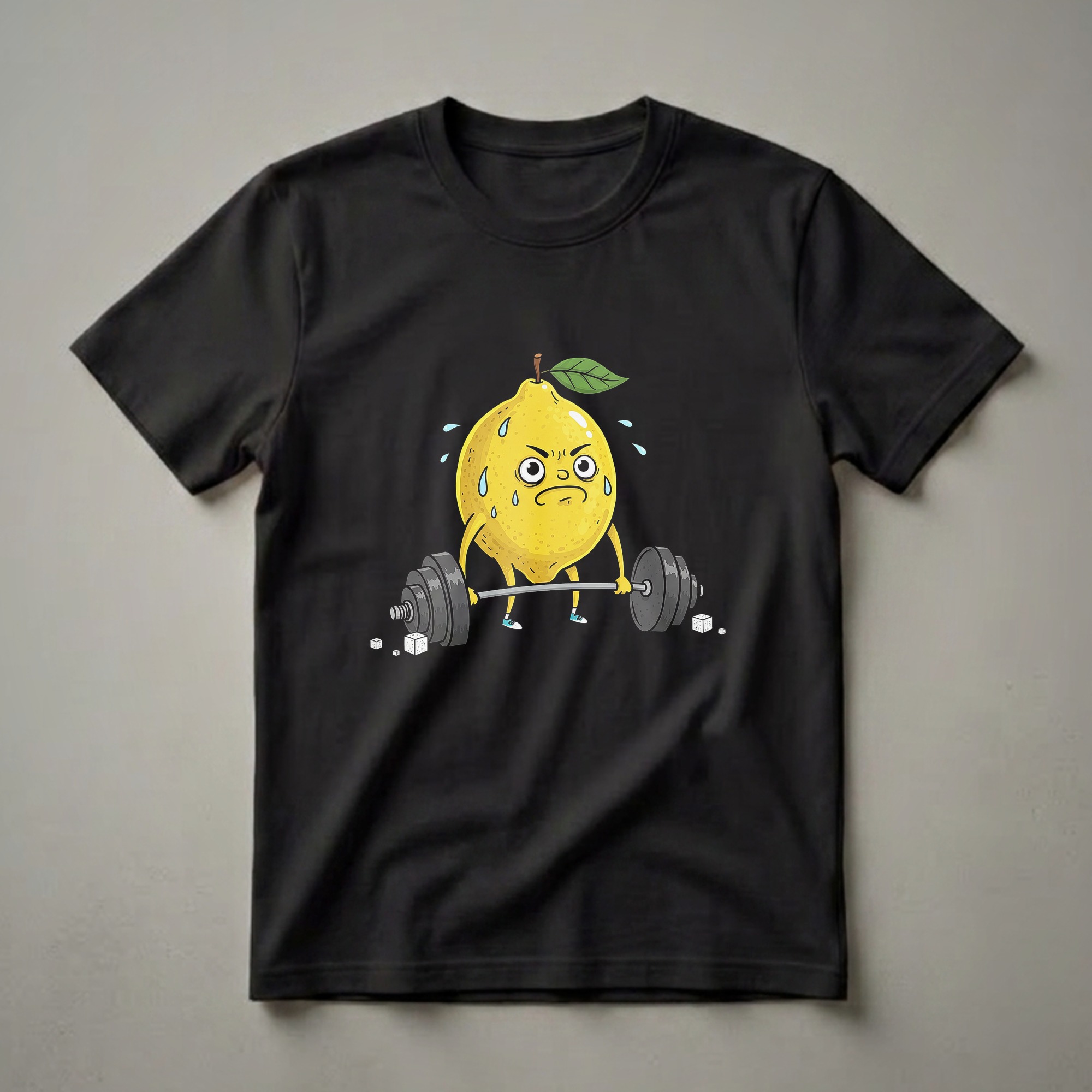 Gym-goers who appreciate a bit of humor will reach for this eye-catching t-shirt. The design features a grumpy-looking cartoon lemon, complete with a leaf and stem, intensely focused on lifting a heavy barbell. Sweat droplets fly from its brow, emphasizing the effort involved in its workout. Scattered around the barbell are small cubes, perhaps representing sugar or weights, adding to the whimsical scene. This graphic tee is a playful nod to the dedication required in fitness, even when facing challenges that might make you feel sour. It’s a staple in the collection for those who understand that pushing your limits can be tough, but also rewarding. This shirt works well for anyone who enjoys a good laugh while hitting the gym or engaging in their favorite physical activity. It makes a thoughtful gift for the fitness enthusiast in your life who doesn't take themselves too seriously. Wear it to your next workout session or casual outing to spark conversations and share a smile. The vibrant yellow of the lemon stands out, making a bold statement about embracing the grind with a sense of fun. This t-shirt is a unique way to express your passion for fitness and your sense of humor.