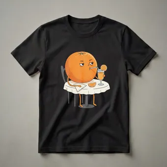 Orange juice lovers and fans of quirky fruit humor will appreciate this eye-catching graphic tee. The design showcases a personified orange sitting at a small table, complete with a tablecloth, napkin, and a slice of orange. This anthropomorphic citrus character is depicted with a slightly unimpressed expression, sipping from a glass of orange juice through a straw, with a garnish of orange slice on the rim. A second slice of orange rests on the table, hinting at the source of the beverage. Oranges, scientifically known as Citrus × sinensis, are a hybrid citrus fruit originating in ancient China and are now cultivated worldwide for their sweet taste and high vitamin C content. This t-shirt works well for anyone who enjoys a good laugh and appreciates creative food-themed art. It makes a thoughtful gift for the foodie in your life, the home bartender who enjoys a mimosa, or anyone who simply loves a good citrus pun. Wear this shirt to your next brunch, a casual get-together, or while enjoying your morning glass of juice.