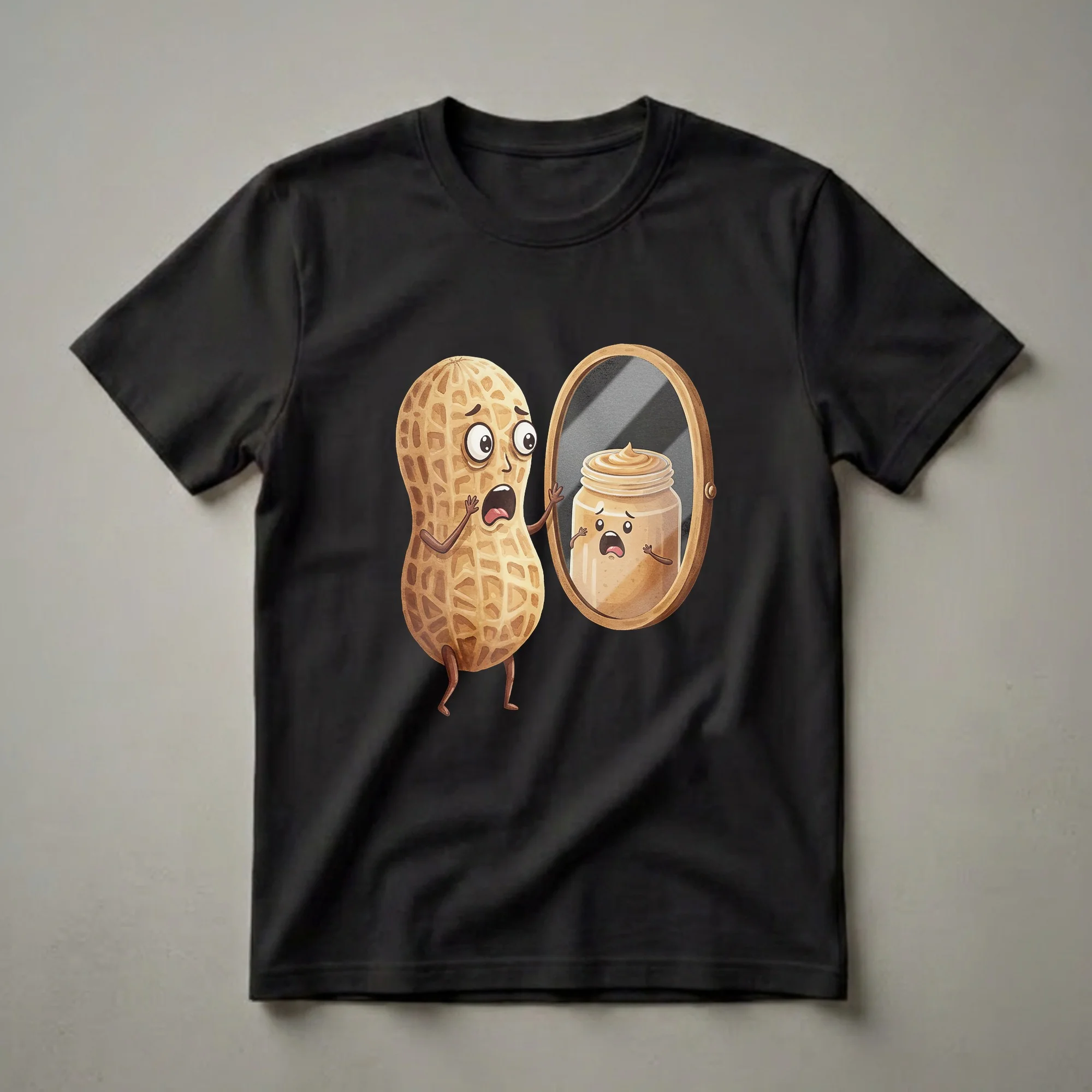Peanut lovers who appreciate a good laugh will reach for this eye-catching graphic tee. The design showcases a cartoon peanut with wide, startled eyes and an open mouth, recoiling in shock as it looks into a mirror. Its reflection reveals a jar of peanut butter, also with a comically distressed expression and arms outstretched. This humorous visual plays on the idea of a peanut's transformation into its beloved spread. Peanuts, scientifically known as Arachis hypogaea, are legumes native to South America and are a staple in many diets worldwide, often processed into the creamy or crunchy butter that many adore. This shirt is a thoughtful gift for the foodie in your life, the snack enthusiast, or anyone who enjoys a bit of quirky humor. It’s a conversation starter, a thoughtful choice for casual outings, game nights, or just lounging around. Wear this tee to express your love for unique food-themed humor and stand out with a design that's sure to get a chuckle.