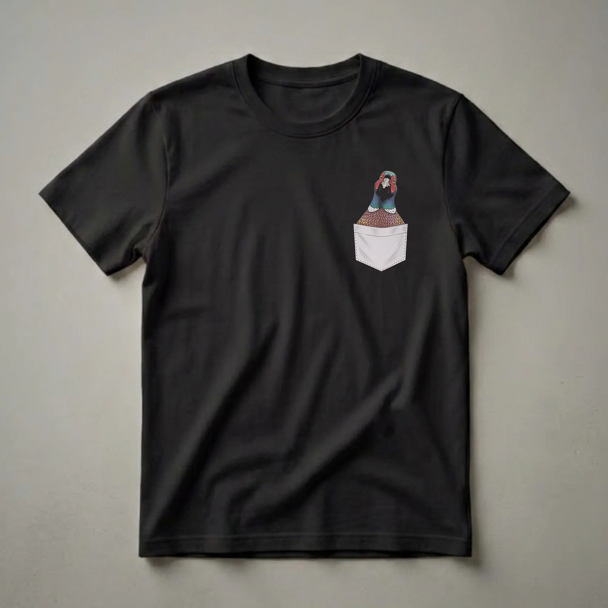 Bird watchers and nature enthusiasts will appreciate this humorous graphic tee featuring a detailed drawing of a pheasant peeking out from a sketched pocket. The pheasant, known for its vibrant plumage and distinctive calls, is depicted with striking detail, showcasing its colorful neck feathers and alert eyes. This unique design offers a playful twist on wildlife appreciation, making it a conversation starter. Pheasants are ground-dwelling birds native to Asia, often found in agricultural areas and grasslands, and are popular game birds. This t-shirt is a thoughtful gift for anyone who enjoys the outdoors, birdwatching, or simply has a quirky sense of humor. It's a staple in the collection for casual wear, a thoughtful choice for a trip to the park, a game night, or a relaxed brunch with friends. The detailed artwork captures the essence of the bird in an unexpected and amusing way, making this shirt a go-to tee for those who love unique animal designs.