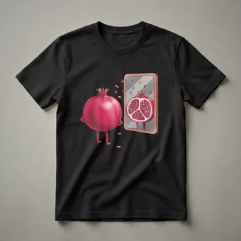 Pomegranates, known for their vibrant red skin and jewel-like arils, are celebrated in this whimsical graphic tee. The artwork depicts a whole pomegranate with a crown-like calyx, standing with its hands on its hips, facing a mirror. The reflection reveals the fruit cut in half, showcasing its juicy, seed-filled interior. Scattered arils add a playful touch to the scene. Pomegranates are native to the region from Iran to northern India and have been cultivated for millennia, valued for their symbolic meanings of fertility and abundance. This eye-catching shirt is a thoughtful gift for foodies, chefs, or anyone who appreciates a bit of fruit-based humor. It's a great conversation starter for casual outings, farmers' market visits, or simply lounging at home. This unique t-shirt offers a fun way to express a love for produce and a good chuckle. This apparel is a staple for anyone with a playful sense of humor.