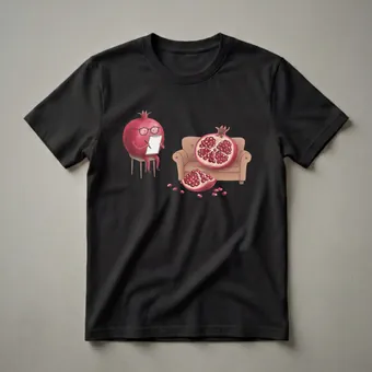 Therapists who appreciate a good pun will reach for this humorous pomegranate t-shirt. The design showcases a whimsical scene where a anthropomorphic pomegranate, complete with glasses and a clipboard, appears to be conducting a therapy session. Beside it, a halved pomegranate sits on a plush couch, with a few arils scattered nearby, suggesting a moment of introspection or perhaps a breakthrough. Pomegranates, known for their abundant seeds, are a symbol of fertility and abundance in many cultures. This eye-catching graphic tee is a playful nod to the therapeutic process, blending fruit humor with a relatable professional scenario. It makes a thoughtful gift for therapists, nutritionists, or anyone with a love for unique, food-inspired art. Wear this shirt to your next casual outing or to a gathering where a good laugh is sure to be had.