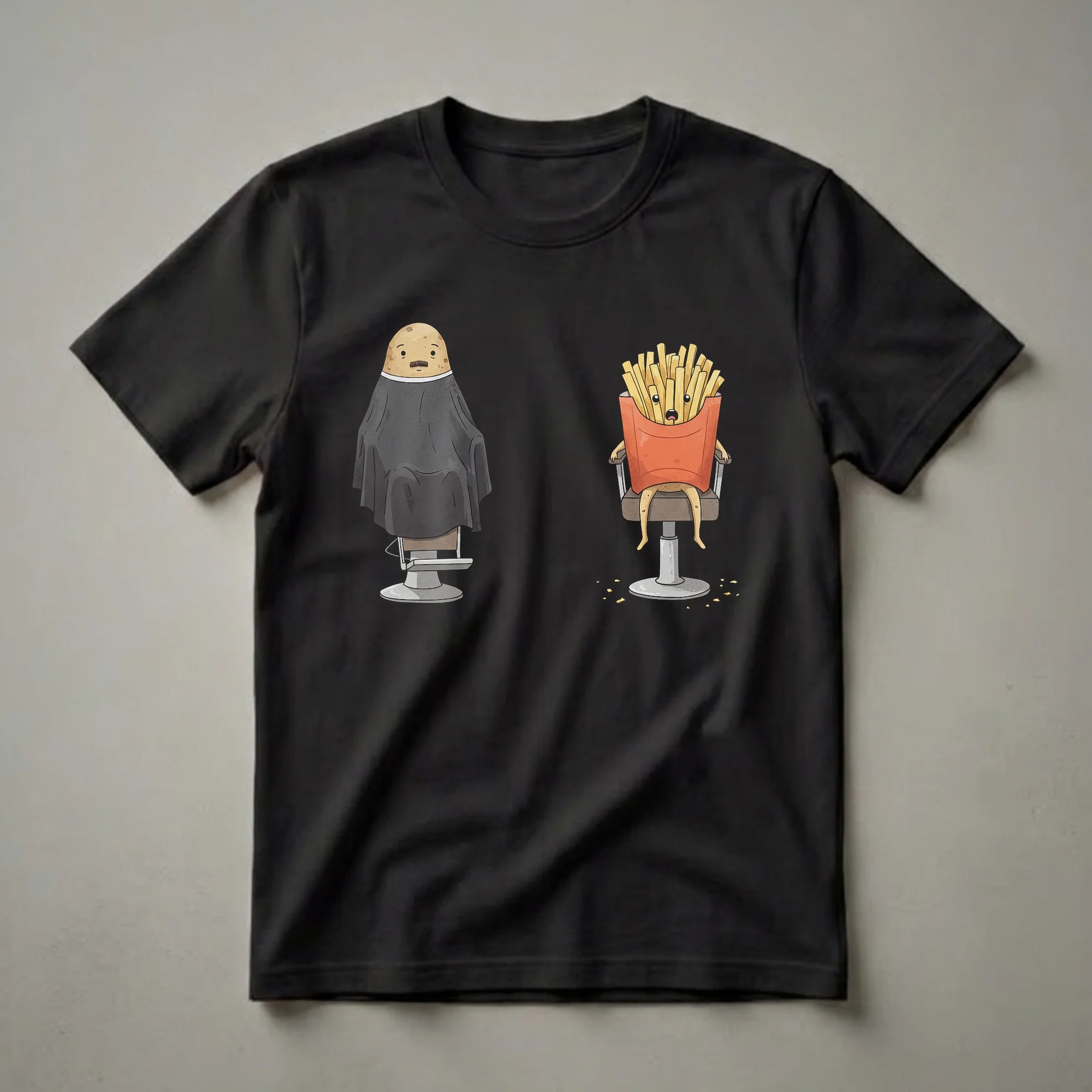 Hairdressers and hairstylists who appreciate a good laugh will reach for this funny potato and french fries graphic tee. The design showcases a potato, complete with a distinguished mustache, sitting in a salon chair draped with a black cape, ready for a trim. Beside it, a box of french fries with wide, surprised eyes and an open mouth sits in its own chair, perhaps contemplating its fate or the potato's transformation. This humorous scene plays on the idea of food items undergoing human-like experiences, making it a unique piece of apparel for anyone in the culinary or beauty industry. Potatoes, a staple crop grown in diverse climates worldwide, are transformed into countless dishes, while french fries are a universally loved snack. This shirt captures a whimsical moment, a thoughtful choice for a hairstylist who enjoys a bit of playful humor in their day. It makes a thoughtful gift for the stylist who always has a joke ready or for anyone who loves a quirky food-themed design. Wear this t-shirt to work to bring a smile to your clients' faces or to casual gatherings where a good conversation starter is welcome.