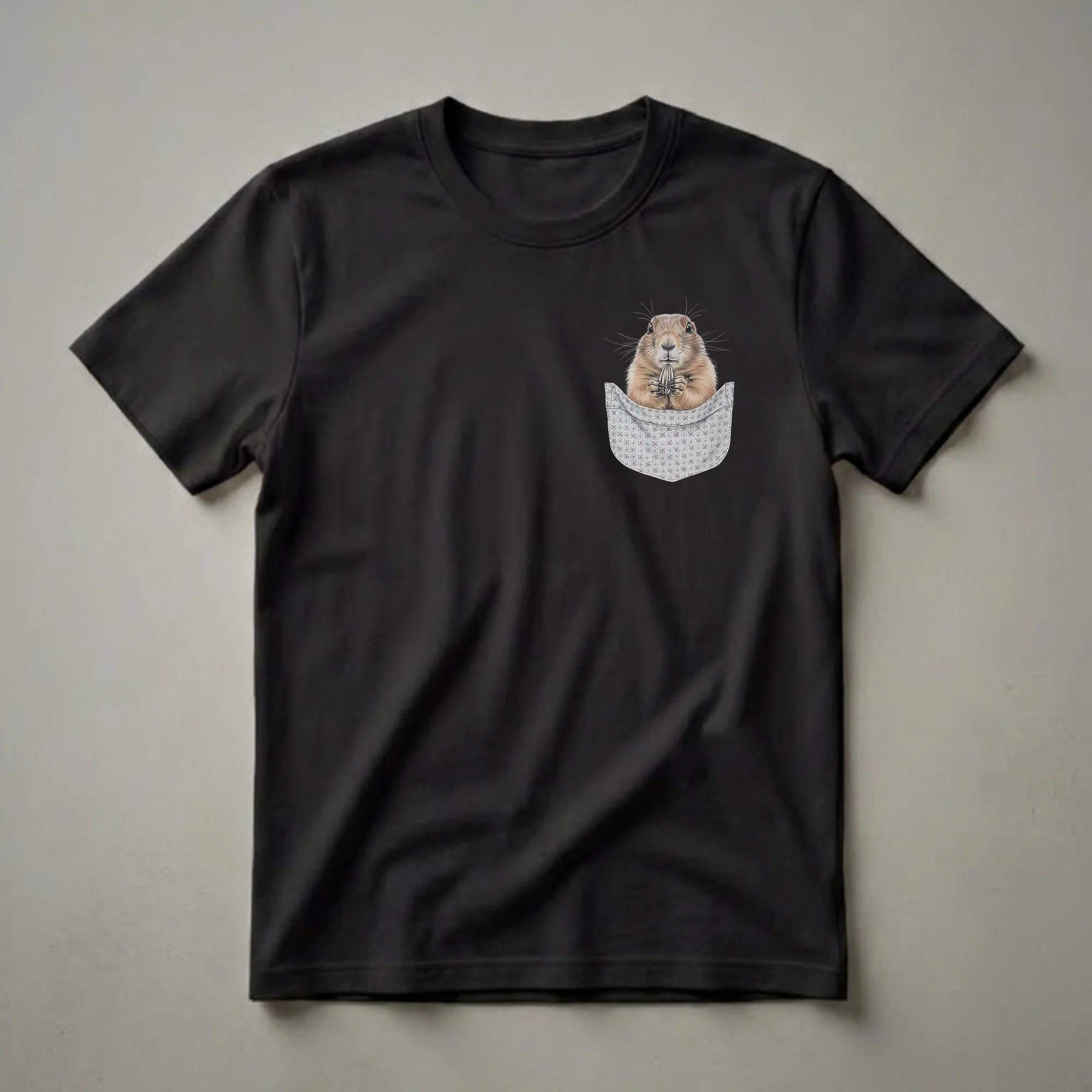 Prairie dog owners and fans of quirky animal humor will reach for this eye-catching tee. The design showcases a meticulously drawn prairie dog peeking over the edge of a patterned pocket, clutching a sunflower seed in its tiny paws. Prairie dogs are social rodents native to North America, known for their complex burrow systems and distinctive alarm calls. This graphic tee captures the charming and curious nature of these fascinating creatures. It's a thoughtful gift for anyone who appreciates unique wildlife art and a good chuckle. This shirt works well for casual outings, game nights, or just lounging around the house. The detailed artwork makes this t-shirt a standout piece for those who love animals with a touch of whimsy. Add this unique prairie dog shirt to your collection for a fun and conversation-starting addition to your wardrobe. Prairie dog colonies can span many acres, showcasing their impressive engineering skills.