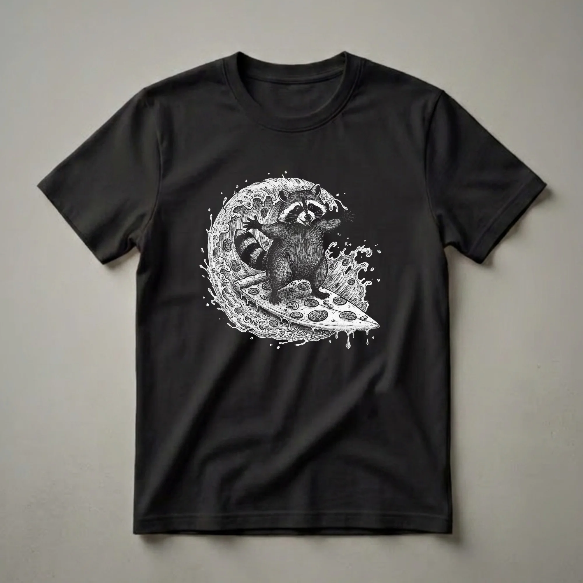 - Raccoon riding a melting pepperoni pizza as a surfboard on a black shirt in black and white ink.