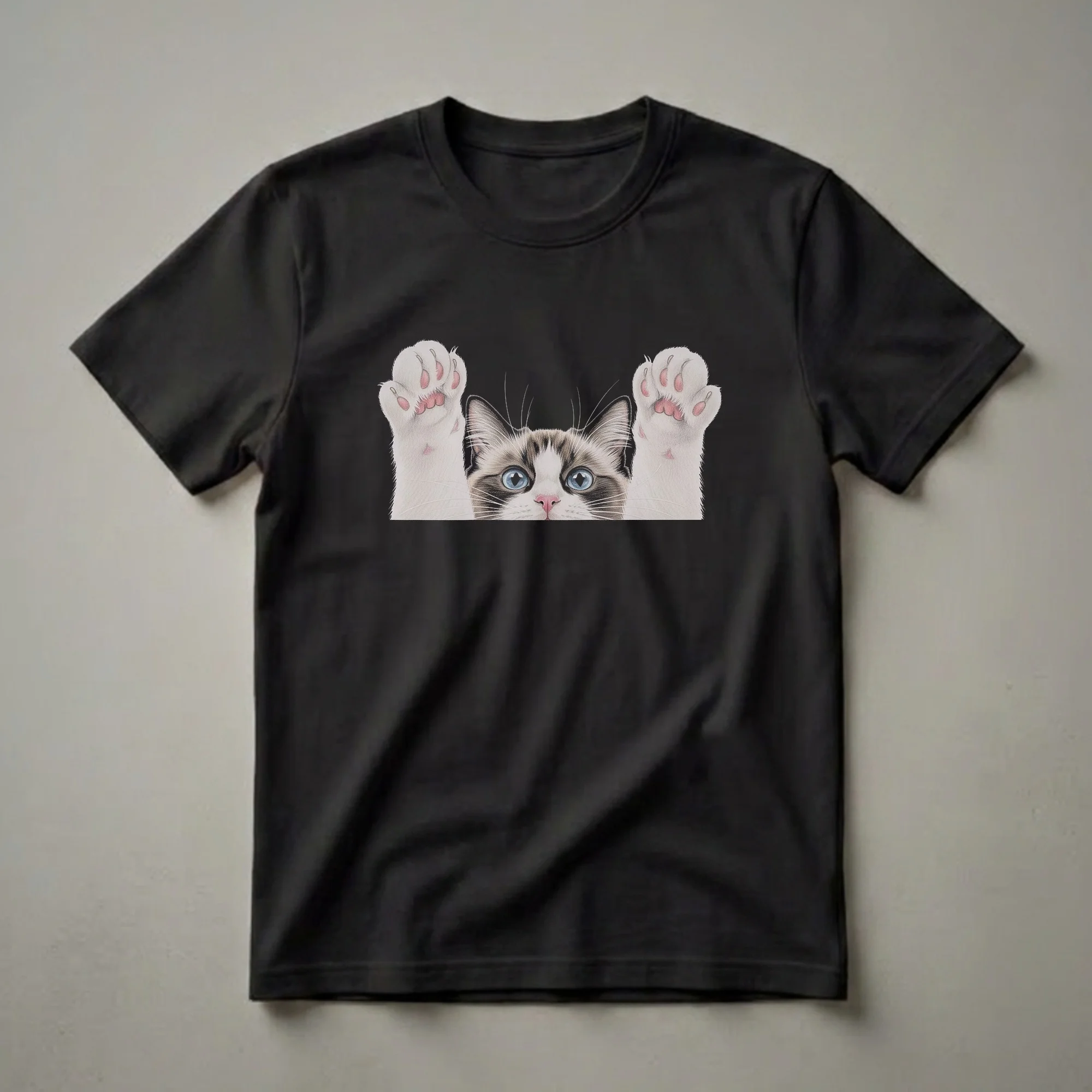 Ragdoll cat owners know the breed's famously docile and affectionate nature, often described as 'puppy-like' due to their tendency to greet you at the door and follow you around the house. This eye-catching graphic tee captures that playful spirit with a striking, realistic drawing of a Ragdoll cat peeking over the edge. The design features the cat's face with piercing blue eyes and a pink nose, framed by delicate whiskers, alongside its fluffy white paws raised as if reaching out. The detailed artwork highlights the soft texture of the fur and the distinct markings of the breed. This t-shirt is a thoughtful gift for any cat mom or cat dad who appreciates the charm and humor of their feline companions. It's a go-to tee for casual outings, game nights, or simply lounging at home with your furry friend. The unique design is sure to spark conversations and bring smiles to fellow cat lovers. Embrace your inner cat person with this delightful piece of apparel that celebrates the joy cats bring into our lives.