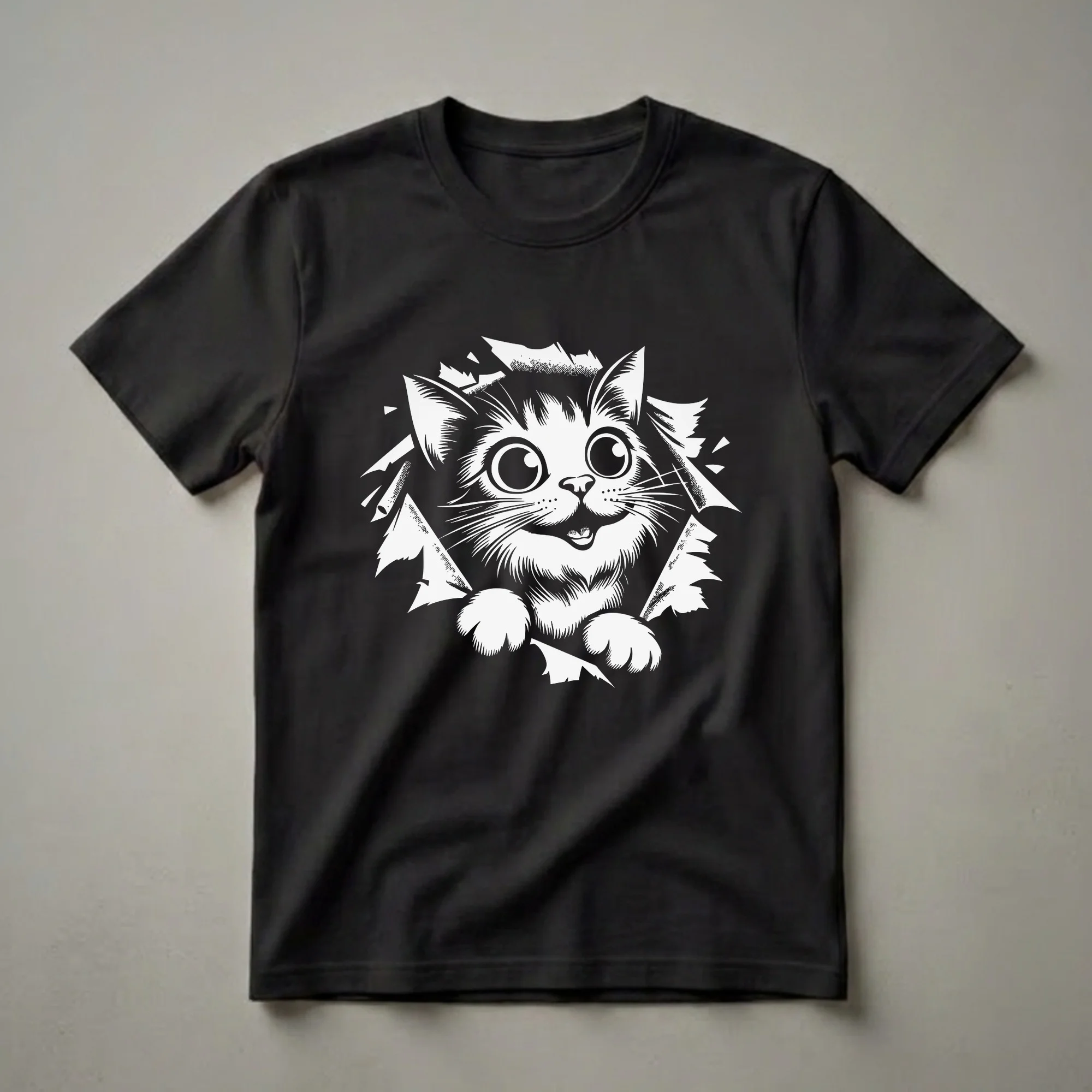 Cat moms and dads who appreciate a good laugh will reach for this unique graphic tee. The design showcases a wide-eyed kitten peeking through a jagged, abstract opening, rendered in a striking black and white retro art style. Its playful expression and exaggerated features are sure to bring a smile to anyone's face. This t-shirt is a fantastic way to express your love for felines and your sense of humor. Cats, known for their curious nature and often mischievous antics, are perfectly captured in this whimsical illustration. Whether your own cat is a master of the surprise pounce or a quiet observer, this shirt celebrates the joy they bring into our lives. It makes a thoughtful gift for the cat enthusiast in your life, a thoughtful choice for casual outings, game nights, or just lounging around the house. This comfortable shirt is a staple in any cat lover's wardrobe, offering a fun and stylish way to showcase your passion for all things feline. Wear it to your next coffee date or family gathering and let your love for cats shine through.