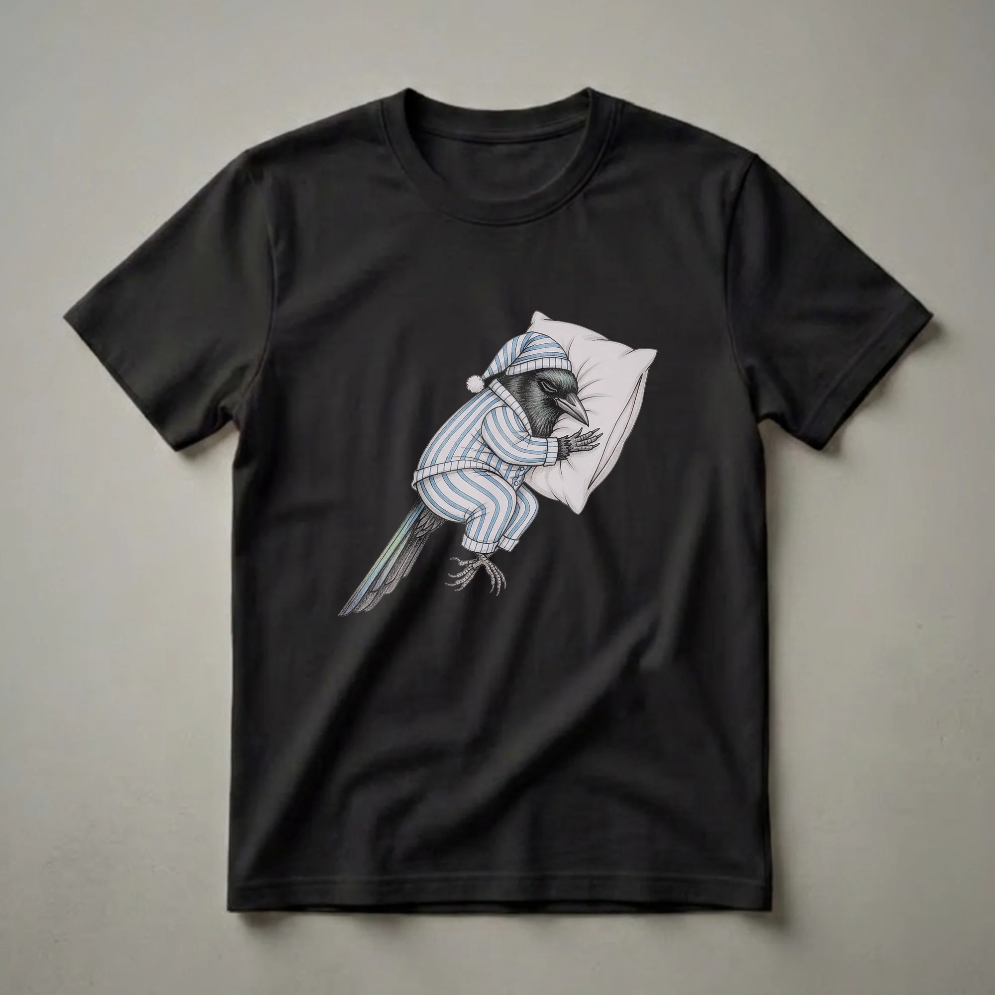Magpies, known for their intelligence and striking black and white plumage, are depicted here in a whimsical, slumbering pose. This unique t-shirt showcases a detailed drawing of a magpie dressed in blue and white striped pajamas and a matching nightcap, nestled comfortably on a soft pillow. The artwork captures the bird in a moment of deep sleep, with its eyes closed and wings tucked in. Magpies are part of the Corvidae family, which also includes crows and ravens, and are found across Europe, Asia, and North America. This graphic tee is a playful nod to the universal desire for rest and relaxation. It's a thoughtful gift for birdwatchers, ornithology students, or anyone who loves a good laugh and appreciates unique animal art. This shirt works well for casual outings, game nights, or simply lounging at home. Imagine wearing this to a relaxed brunch or a cozy evening in, sparking conversations about your love for birds and your appreciation for a well-deserved nap. The detailed drawing style adds an artistic touch, making this more than just a funny shirt; it's a piece of wearable art that celebrates the lighter side of nature.