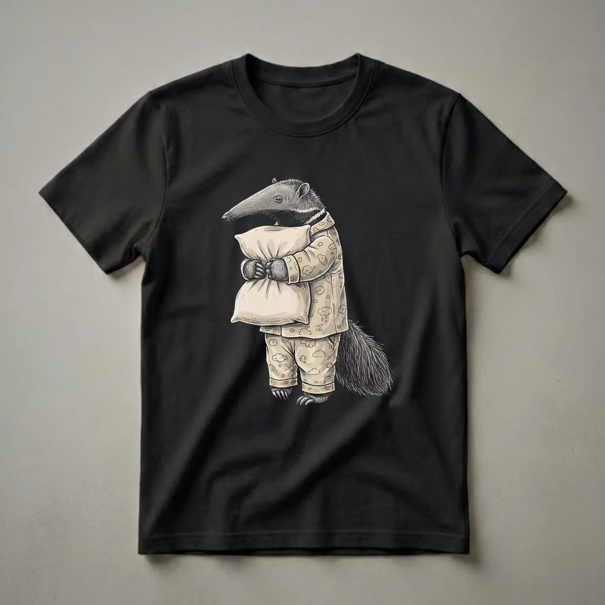 Anteater owners and fans of unique animal apparel will reach for this tee. This eye-catching graphic shirt features a charming illustration of a sleepy anteater dressed in pajamas, complete with a cloud and raindrop pattern. The anteater is depicted holding a plush pillow, ready for a nap. Anteaters, known for their long snouts and specialized diets, are fascinating creatures found in Central and South America. This pajama-themed shirt captures a humorous and relatable moment, making it a go-to tee for anyone who appreciates a good night's sleep or loves quirky animal designs. It makes a thoughtful gift for friends or family members who enjoy a relaxed vibe and a touch of whimsy. Wear this comfortable t-shirt to bed, during lazy weekend mornings, or to a casual get-together with fellow animal enthusiasts. It's a fun way to express your love for these unique mammals and your appreciation for a cozy night in. This shirt is a staple in any collection of funny animal-themed clothing.