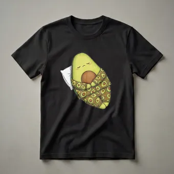 Avocado lovers who appreciate a good laugh will adore this sleepy avocado tee. The graphic showcases a charming cartoon avocado, complete with its pit, snuggled under a patterned blanket and resting on a fluffy white pillow. The avocado itself is depicted wearing a cozy pajama set adorned with a repeating pattern of sliced avocados, highlighting its love for the fruit. This whimsical design captures the essence of relaxation and comfort, making it a go-to tee for lounging or sleeping. Avocados, known for their creamy texture and healthy fats, are a staple in many diets, often enjoyed in dishes like guacamole or avocado toast. This shirt celebrates the fruit in a playful, lighthearted way. It makes a thoughtful gift for friends or family members who can't get enough of avocados, or for anyone who enjoys a humorous and unique graphic tee. Wear this comfortable shirt to bed for sweet dreams or to a casual brunch with friends who share your appreciation for all things avocado.