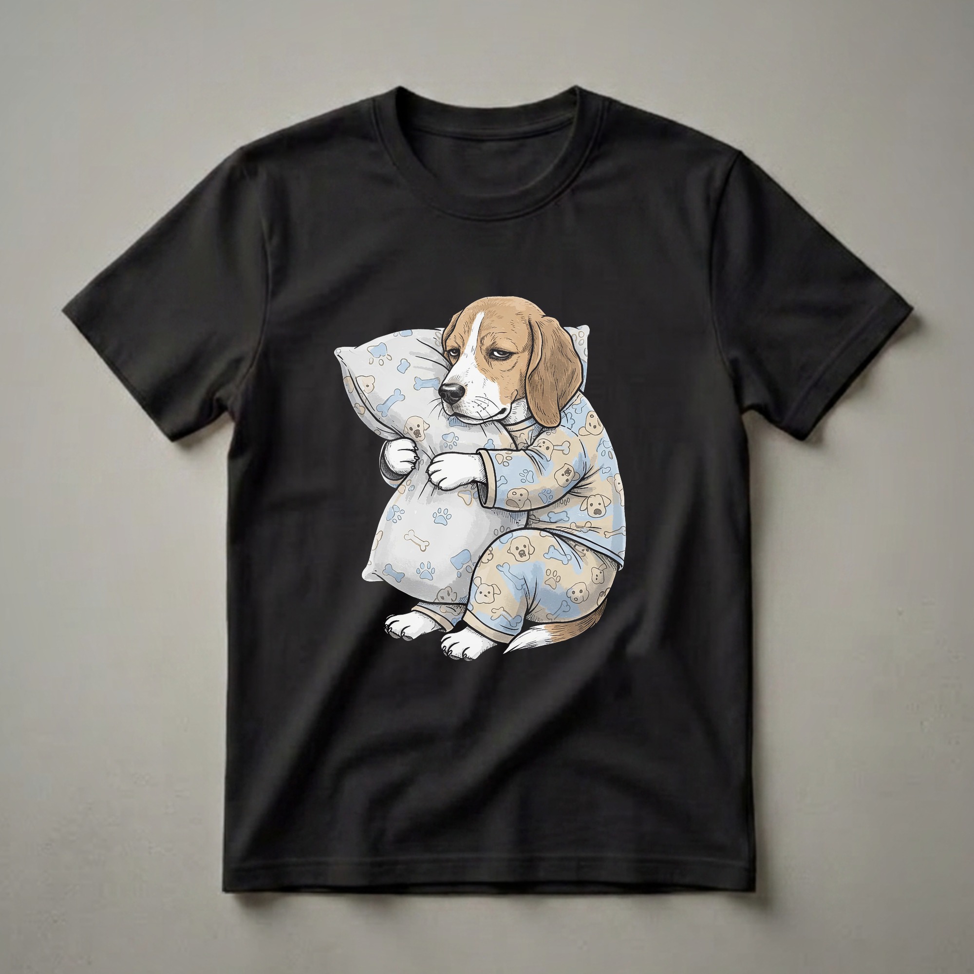 Beagle owners know the breed's distinctive tri-color coat and their penchant for napping. This eye-catching graphic tee captures that sleepy spirit with a charming illustration of a beagle dog dressed in blue pajamas adorned with paw prints and bones. The dog is shown snuggled up with a pillow, its eyes half-closed, embodying the ultimate cozy moment. Beagles, known for their friendly and curious nature, often enjoy a good rest after a day of exploring. This t-shirt is a thoughtful gift for any beagle mom or dad who appreciates a good night's sleep or simply loves their furry friend's relaxed demeanor. It's a staple in the collection for anyone who identifies with the desire for comfort and a bit of canine charm. Wear this tee to relax at home, during casual outings, or as a fun pajama top. It's a unique way to showcase your affection for beagles and your appreciation for a laid-back lifestyle. This shirt is a go-to tee for dog lovers everywhere.