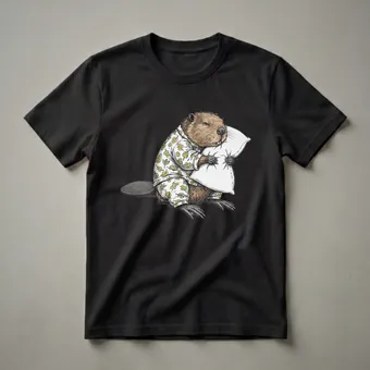 Beavers, known for their industrious nature and dam-building skills, are depicted here in a moment of pure relaxation. This graphic tee showcases a charming illustration of a beaver dressed in a white pajama set adorned with a repeating pattern of green and yellow leaves. The beaver is shown curled up, embracing a fluffy white pillow, its eyes closed in a peaceful slumber. This design captures the humorous contrast between the beaver's typically busy life and its desire for rest. It's a delightful piece of apparel for anyone who appreciates wildlife humor or simply loves a cozy night's sleep. The intricate linework and subtle coloring bring the sleepy rodent to life, making it a unique addition to any casual wardrobe. This t-shirt makes a thoughtful gift for friends or family members who are animal enthusiasts or who often find themselves dreaming of a good nap. Imagine wearing this tee to a casual game night or while lounging at home, sharing a chuckle with fellow fans of quirky animal designs. The beaver's relaxed posture and the soft leaf pattern on its pajamas create a comforting and whimsical visual that resonates with anyone who enjoys a bit of lighthearted fun in their clothing.