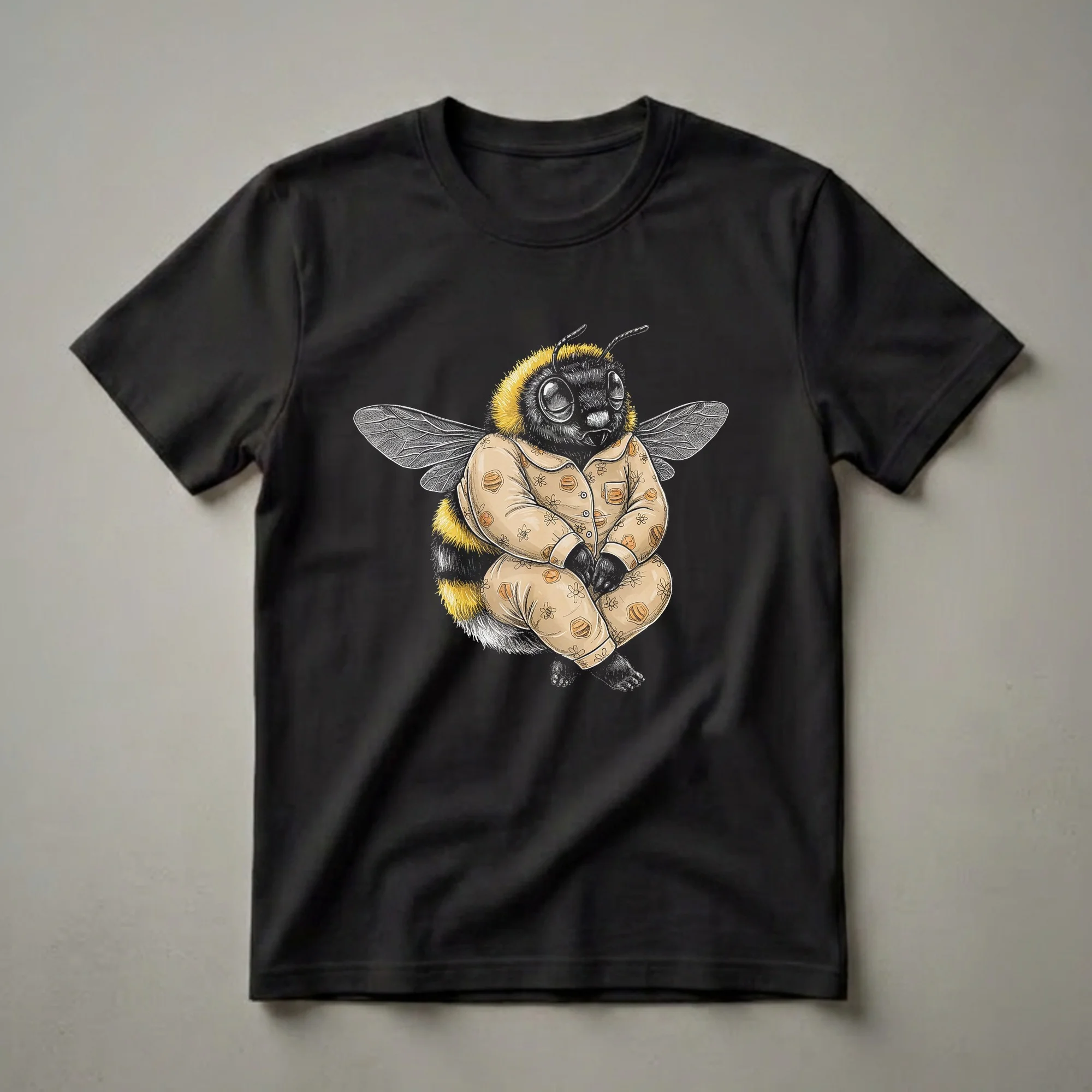 Beekeepers who love their buzzing companions will reach for this humorous bee t-shirt. This graphic tee features a charming bumblebee dressed in a cozy pajama set, complete with a playful honeycomb and floral pattern. The bee looks utterly relaxed, with its eyes closed and a peaceful expression, making it a relatable symbol for winding down after a day's work or simply enjoying a quiet moment. Bees are crucial pollinators, vital to agriculture and biodiversity, and this shirt celebrates the industrious nature of these fascinating insects in a fun, lighthearted way. It is a staple in the collection for anyone who appreciates the intricate world of beekeeping or has a soft spot for these fuzzy, stripey creatures. This comfortable tee works well for lounging at home, attending casual gatherings, or as a thoughtful gift for the beekeeper in your life who appreciates a good chuckle. Show your love for bees and comfort with this eye-catching pajama-clad bee shirt.